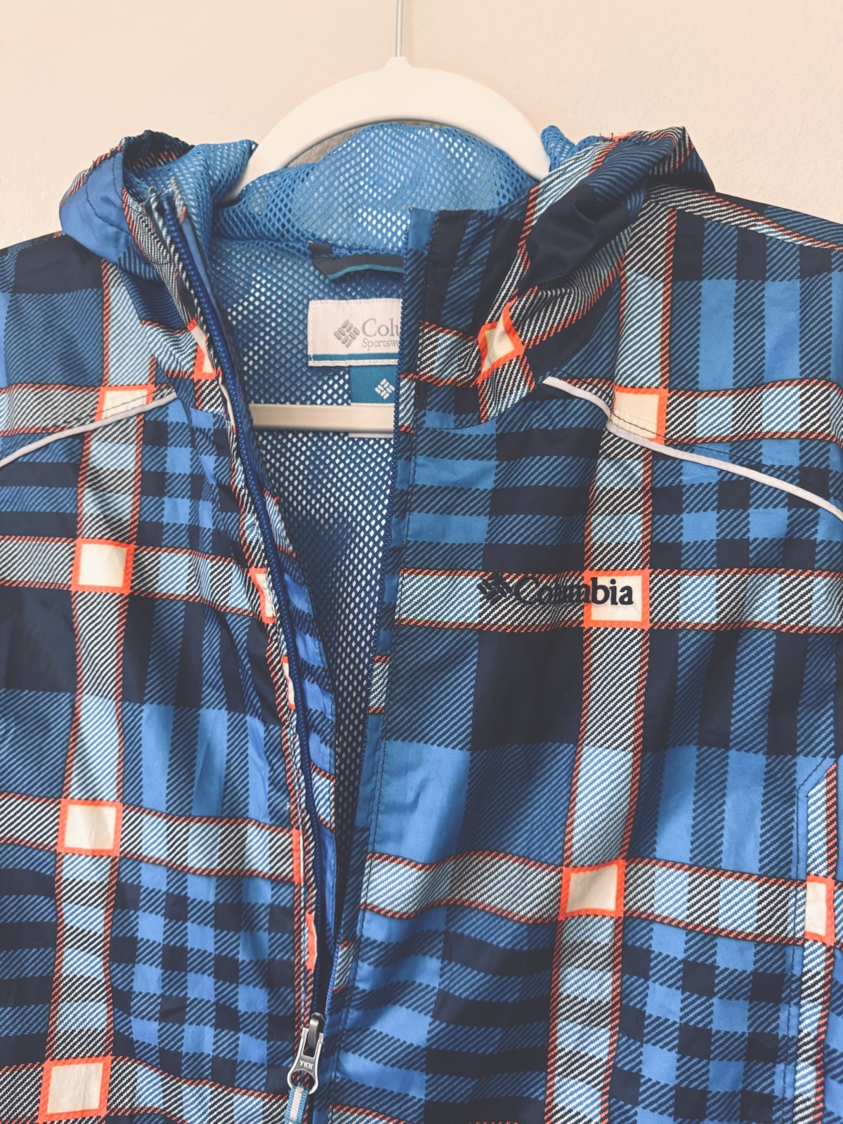 как выглядит Columbia Blue Plaid Rain Hooded Zip Mesh Lined Jacket Youth L 14 16 фото