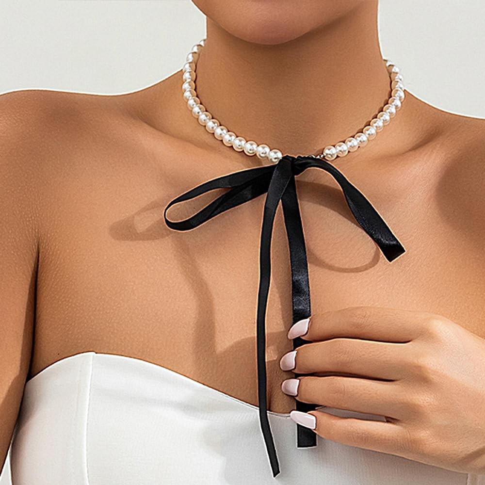 Pearls Bow Ribbon Choker Necklace for Women,Satin Lace Up Long Ribbon Bowkn - 01