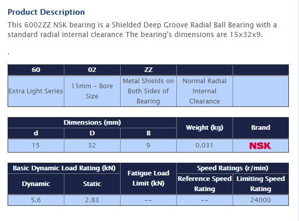 NSK 6002 ZZ Deep Groove Radial Ball Bearing 15x32x9mm