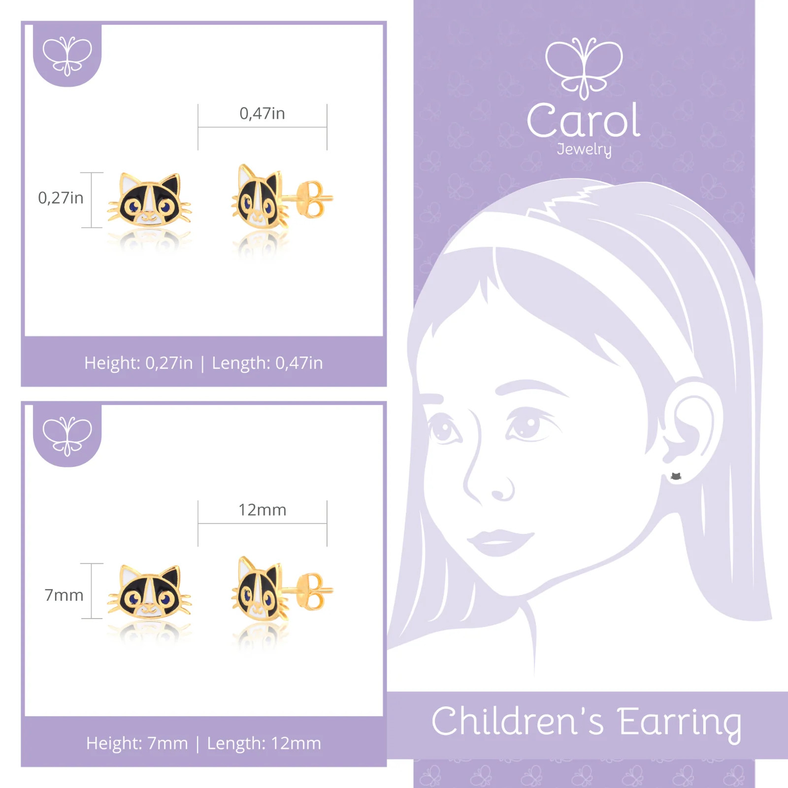 14k Gold Cat Face Earrings Enamel Studs with Backs