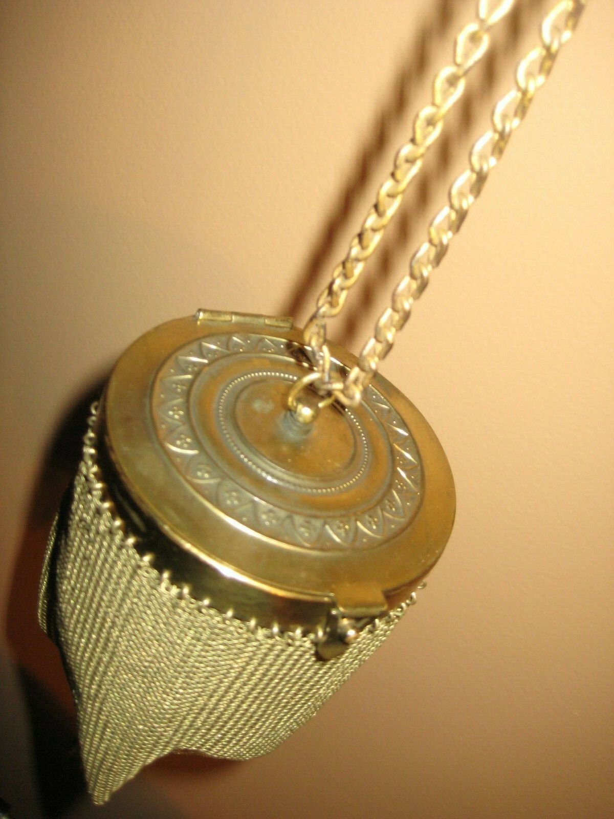 VINTAGE ANTIQUE VICTORIAN METAL MESH, CIRCULAR COIN PURSE WITH CHAIN STRAP