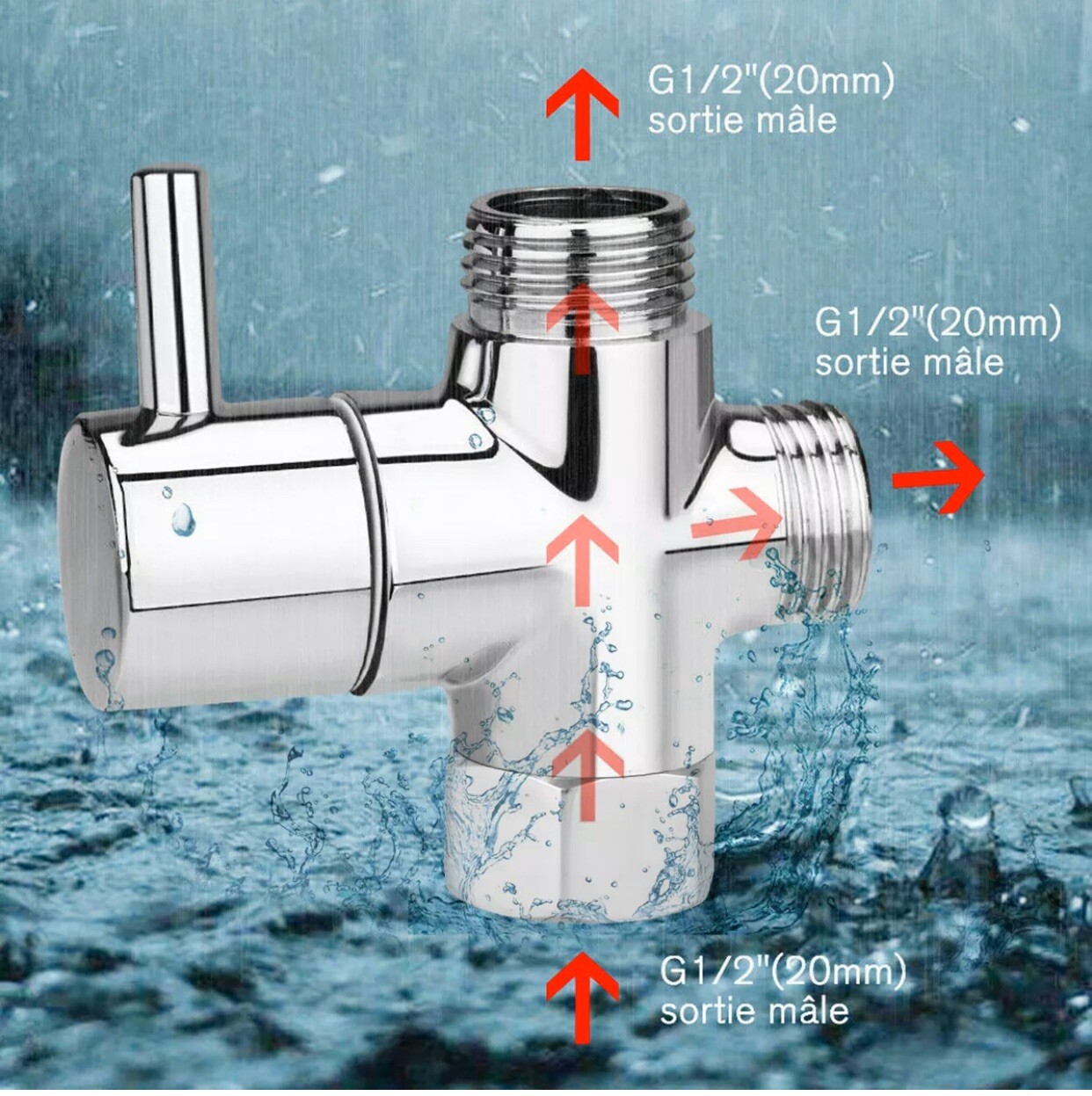 3-Way Chrome T-adapter Valve For Shower Head Diverter Valve Bathroom Toilet 1/2