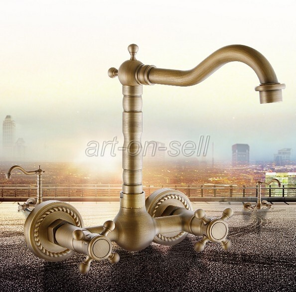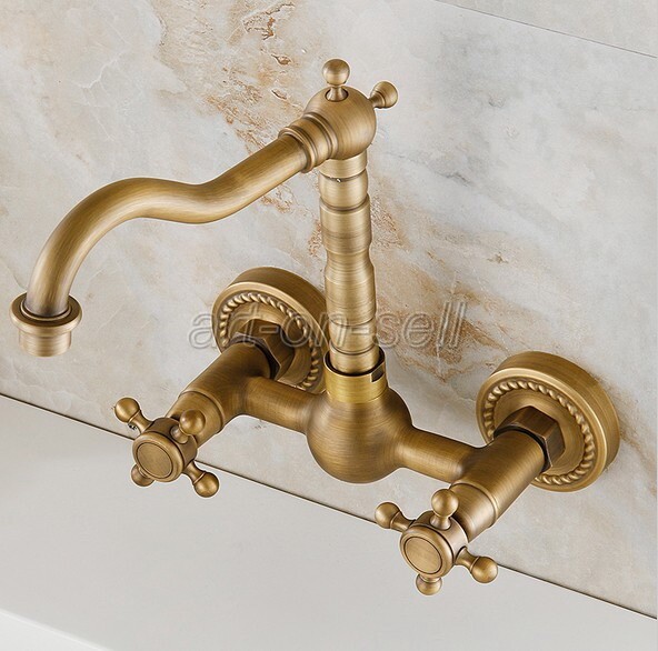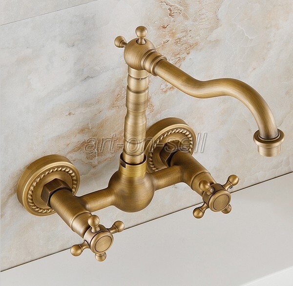 как выглядит Antique Brass Bathroom Sink Faucet Dual Cross Handle Wall Mounted Mixer Tap фото