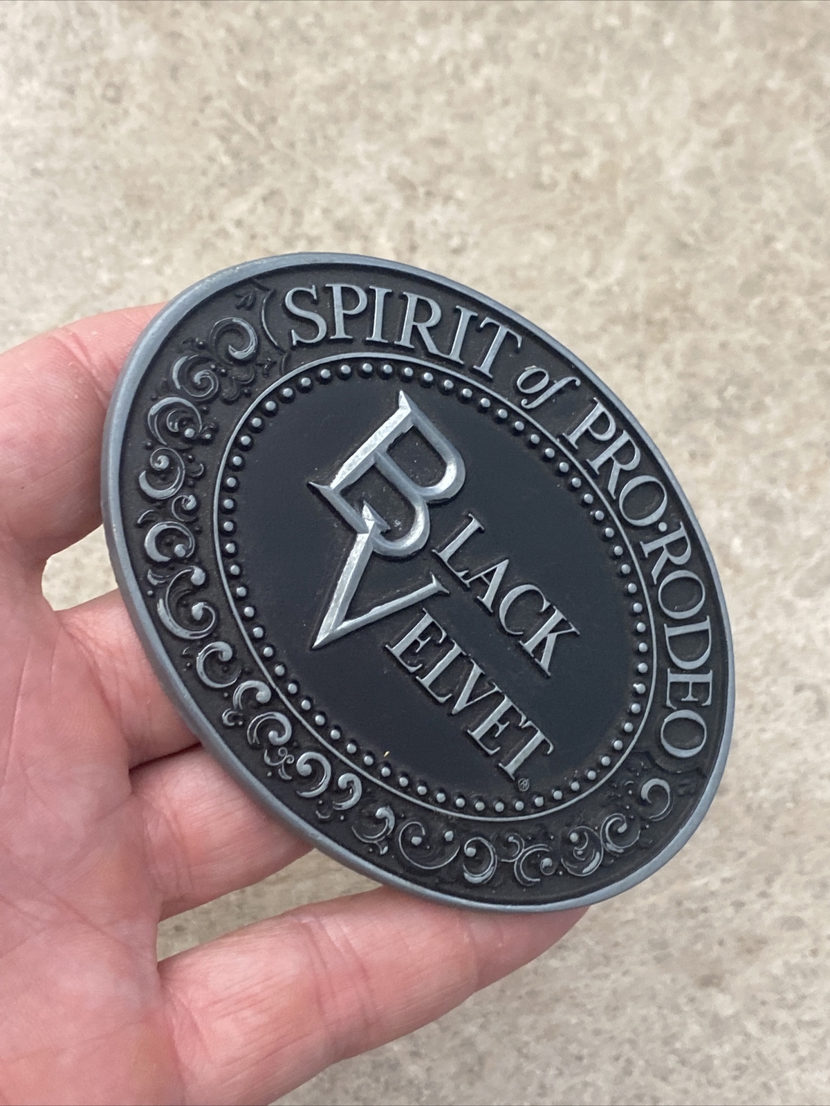 VINTAGE BLACK VELVET BELT BUCKLE 1979 SPIRIT OF PRO-RODEO WHISKEY BOOZE