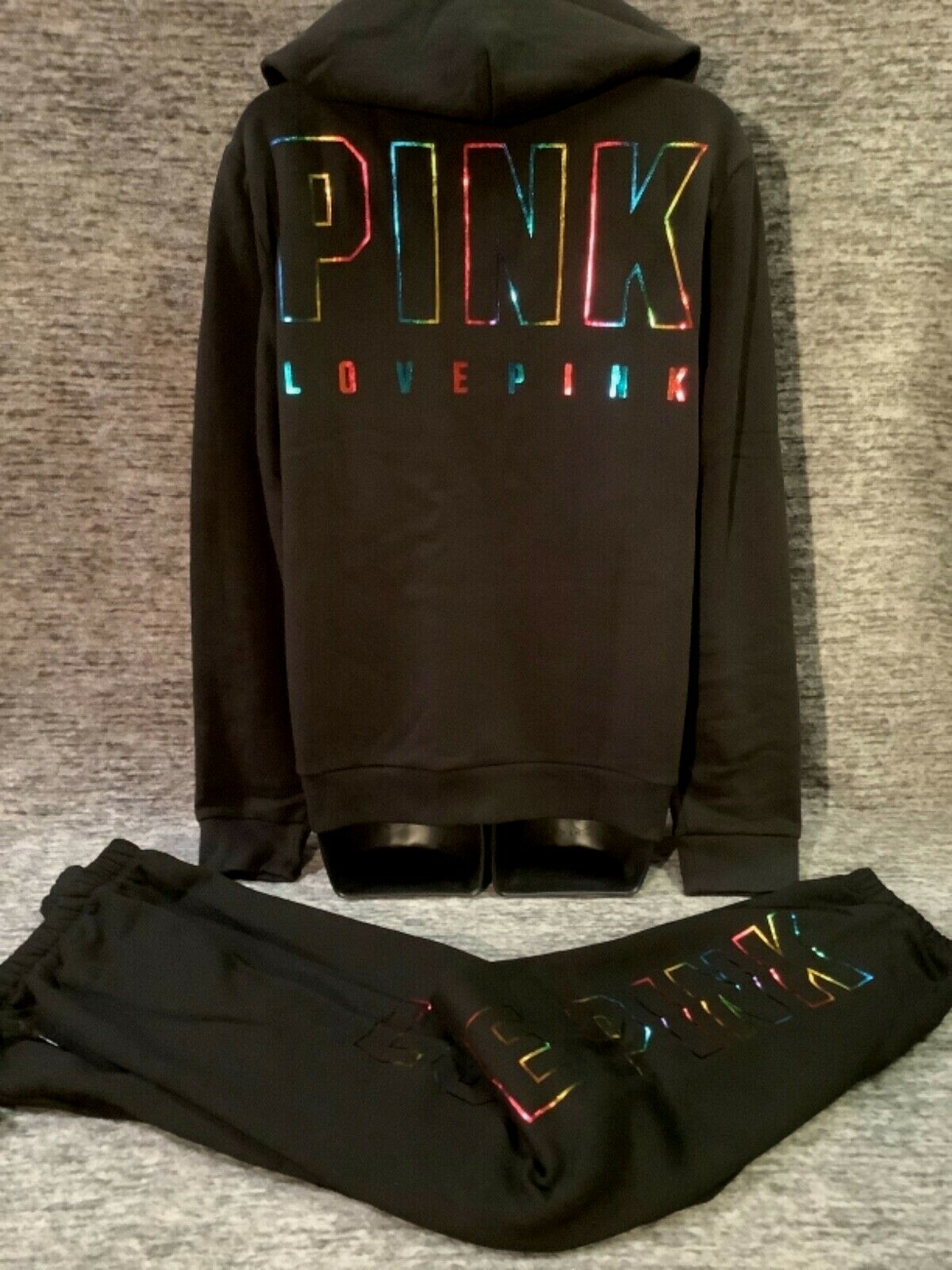 Victoria's Secret Pink Bling Ombre Rainbow FZ Hoodie Pants Set Black Foil L