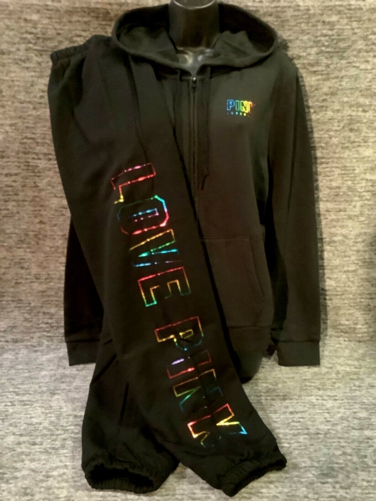 как выглядит Victorias Secret Pink Bling Ombre Rainbow FZ Hoodie Pants Set Black Foil L фото