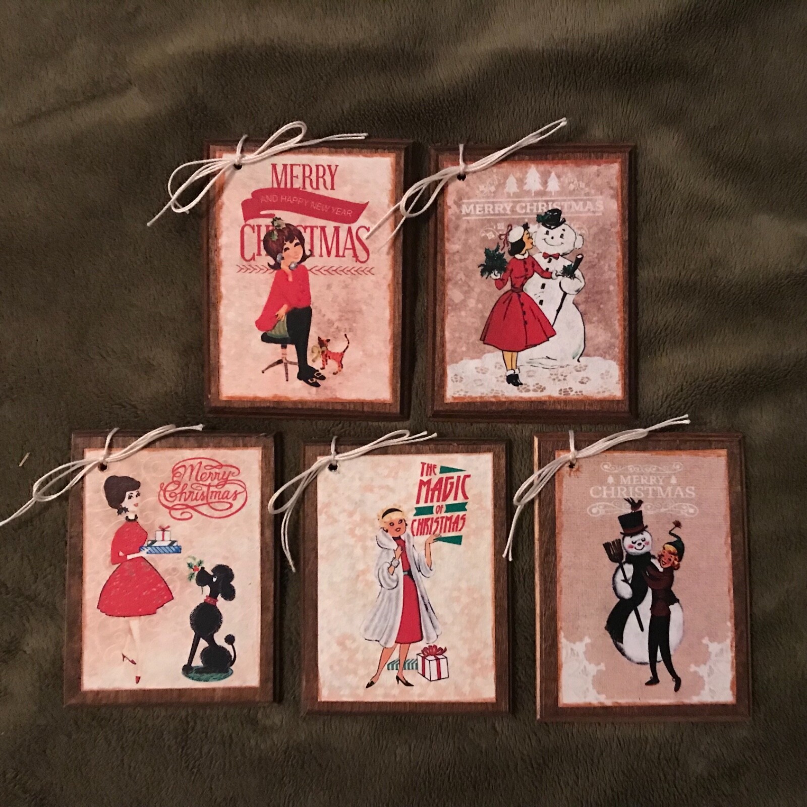 5 Handcrafted Wooden RETRO LADIES Christmas Ornaments / Hang Tags Set2A