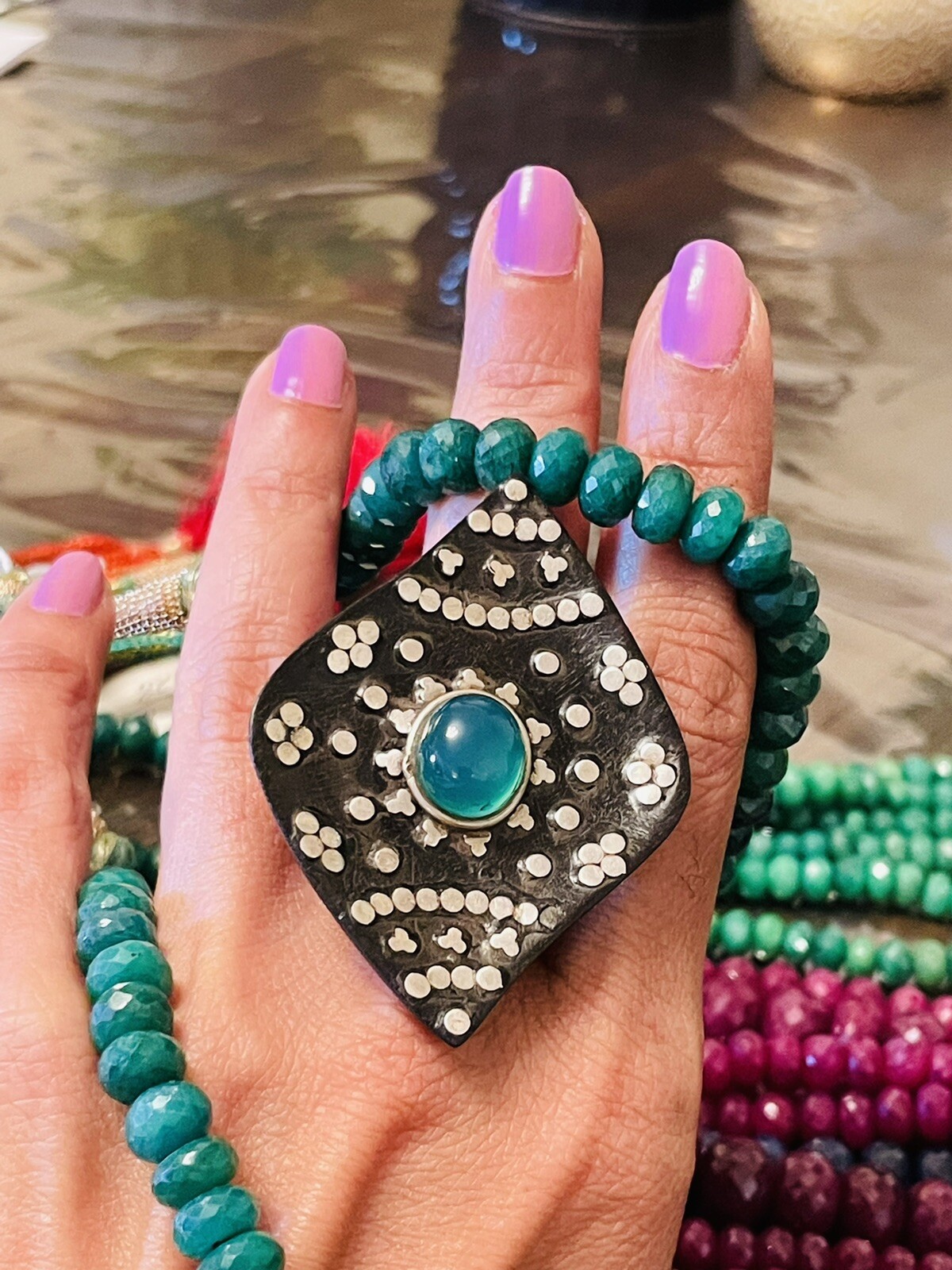 как выглядит Handmade Wood, Green Onyx and Sterling Silver Ring фото