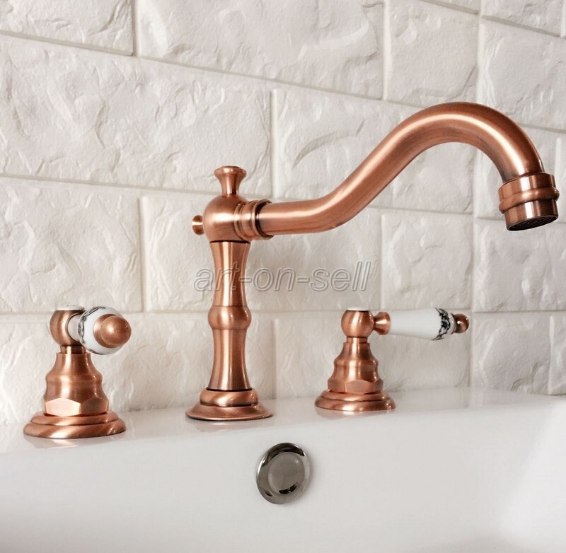 как выглядит Retro Red Copper Widespread 3 Holes Bathroom Sink Faucet Dual Handles Mixer Tap фото