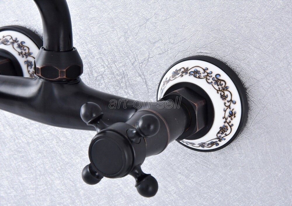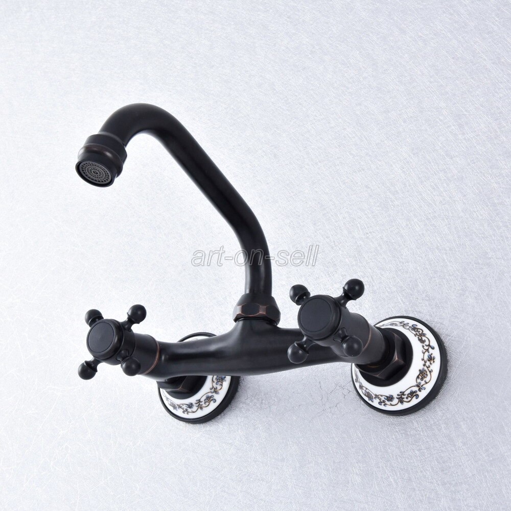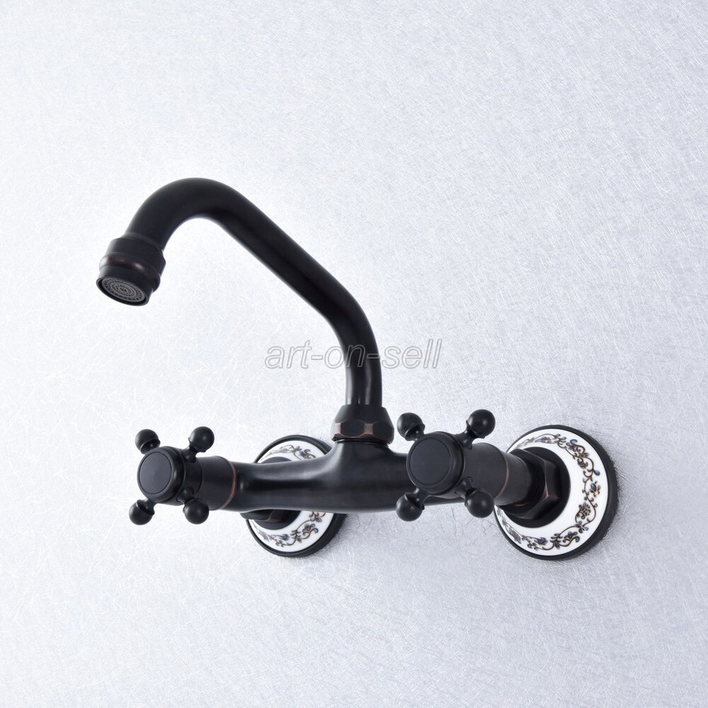 Oil Rubbed Bronze Bathroom Basin Sink Faucet Dual Handles Mixer Tap Wall Mount