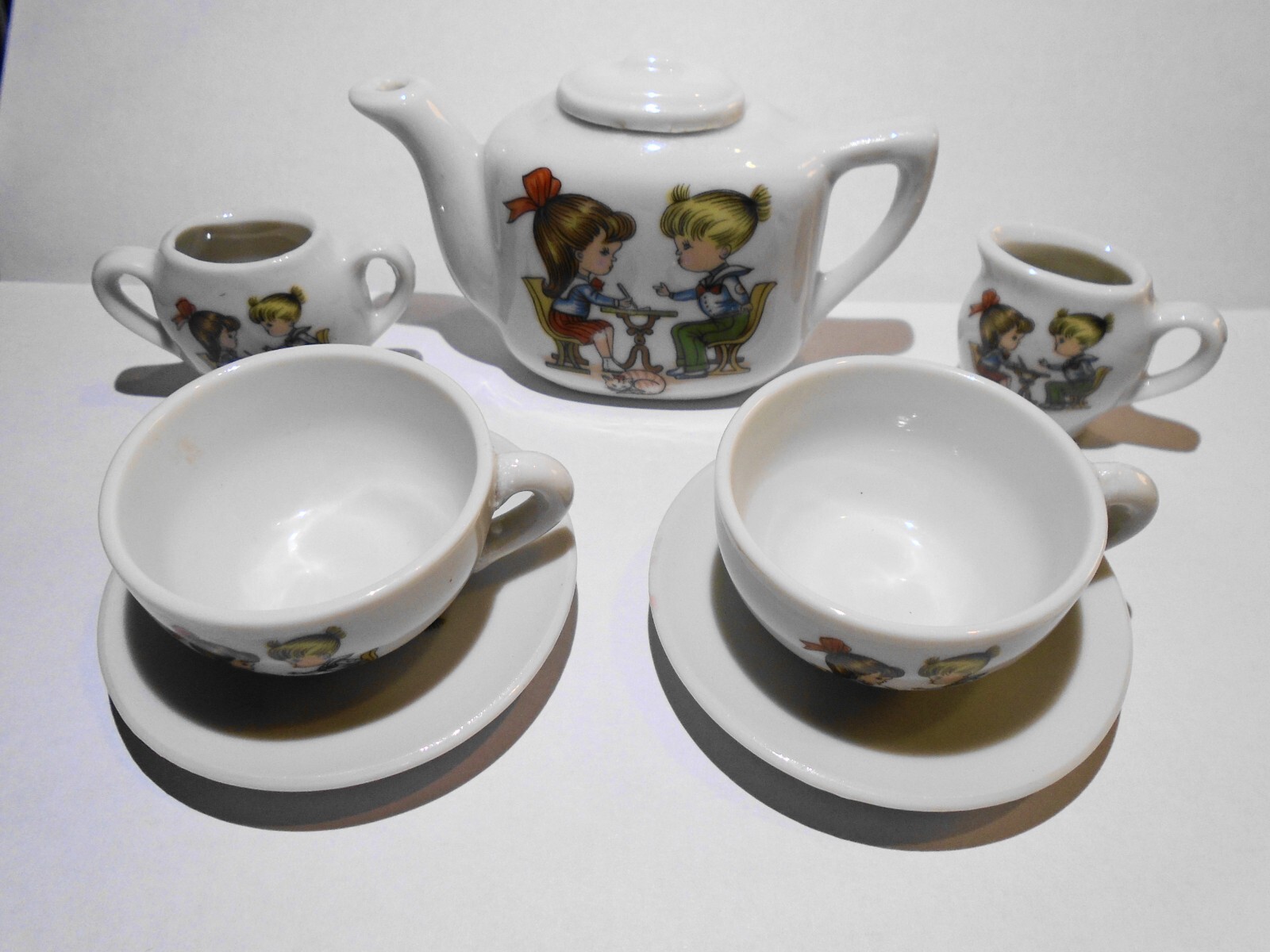 Vintage Child's Miniature Tea Set - Children with Cat, 8 Pieces Made in Japan