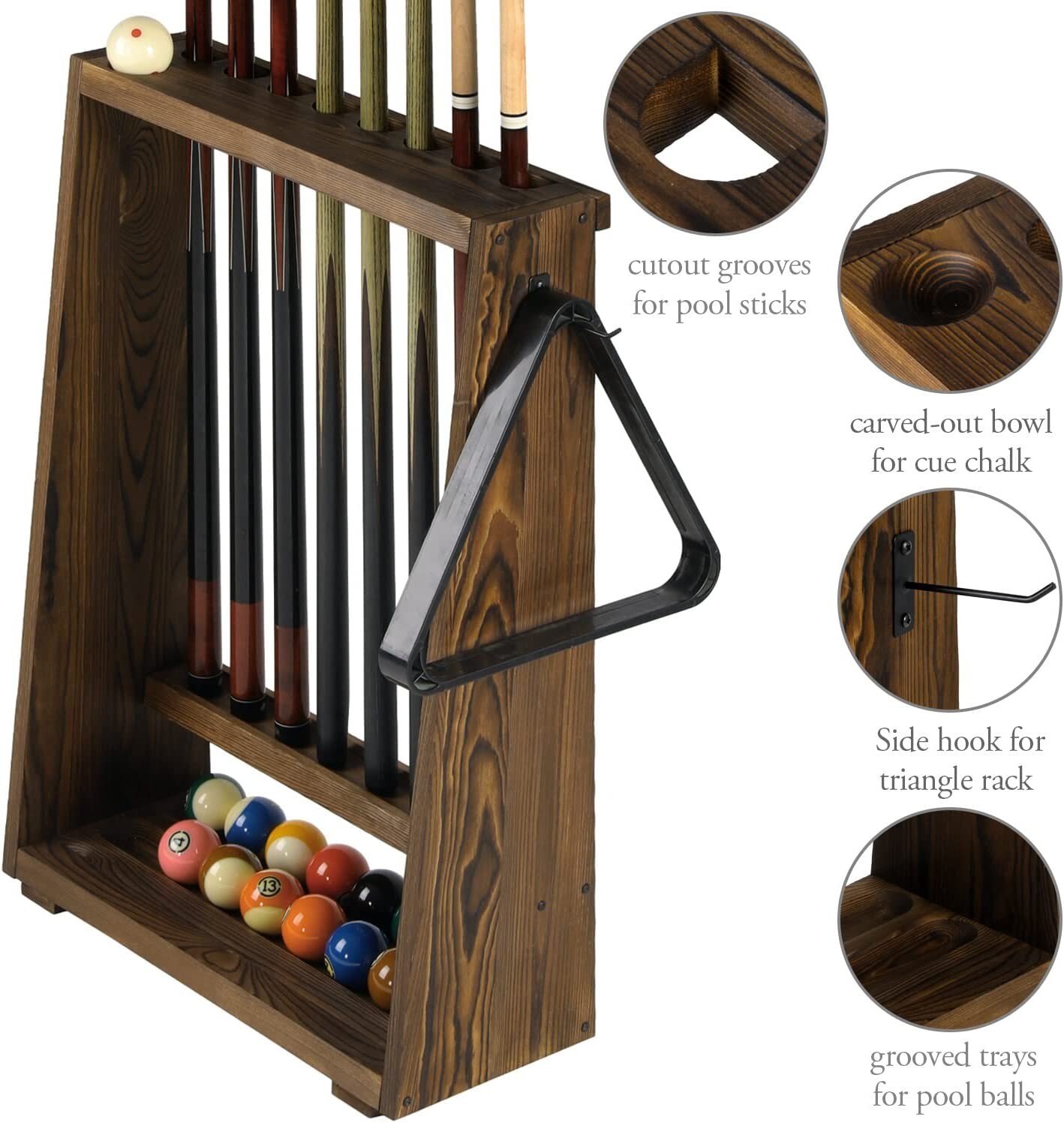Burnt Brown Wood Freestanding Billiards Pool Cue Rack w/ Ball Storage Shelf Set