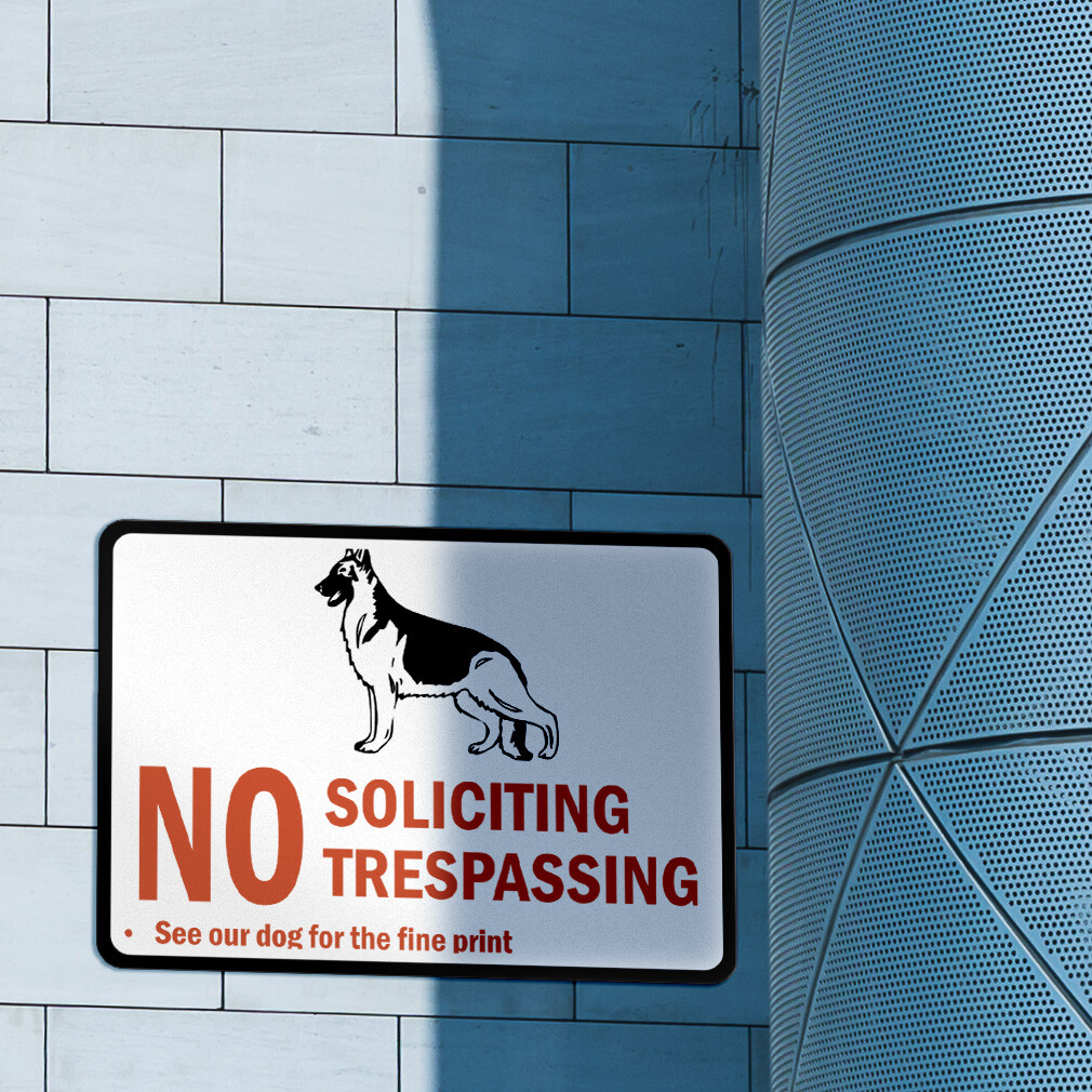 Horizontal Metal Sign No Soliciting Trespassing See Our Dog for The Fine Print