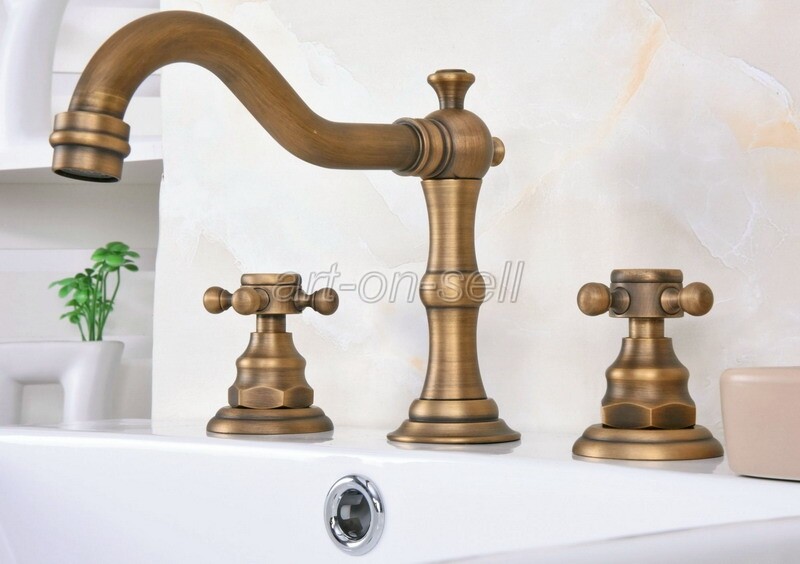 как выглядит Widespread Bathroom Sink Faucet 3 Holes Two Handles Antique Brass Mixer Tap фото