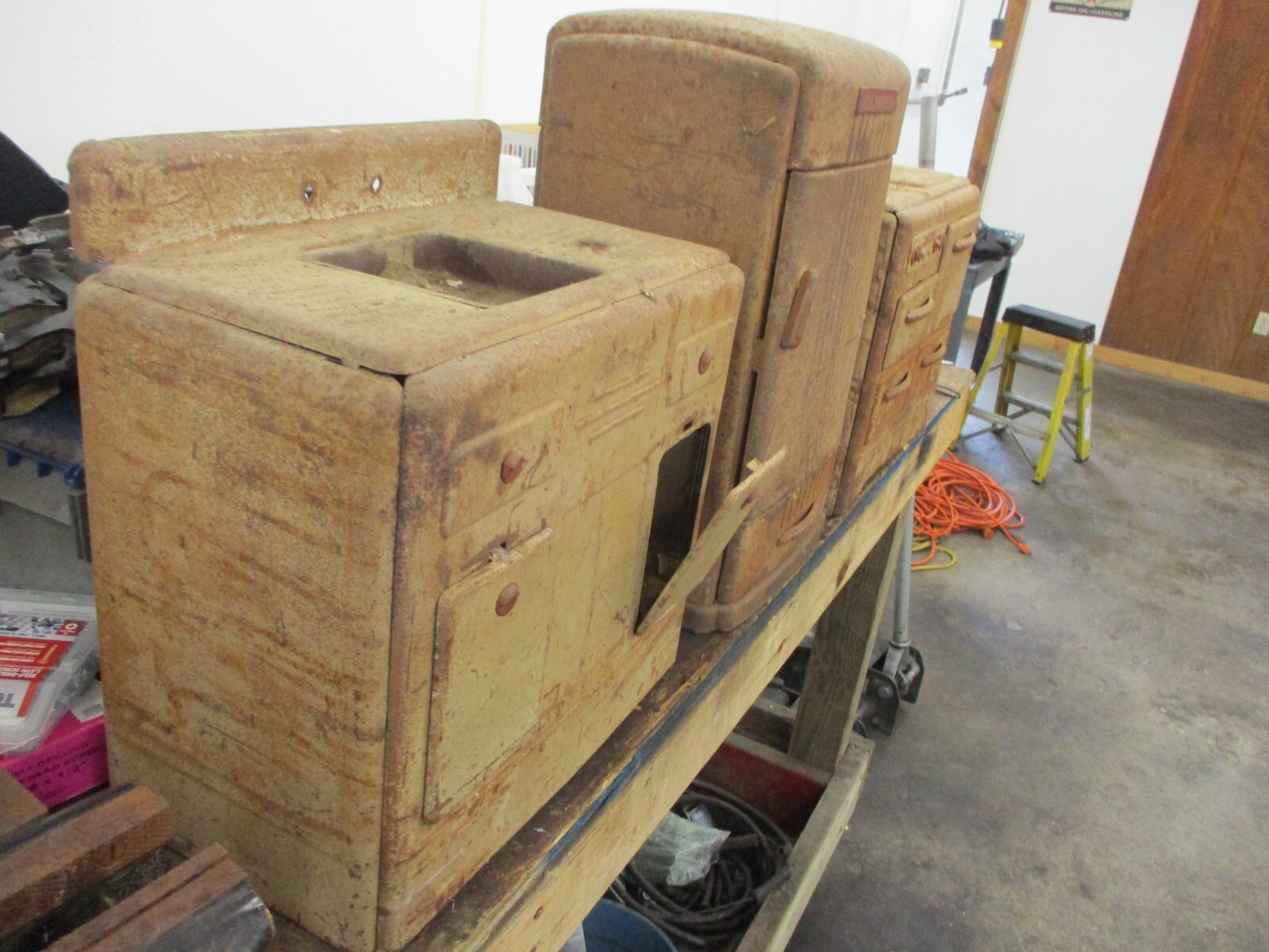 SET of 3 Vintage Tin STOVE REFRIGATOR SINK Cabinet San Diego Jr Doll Furniture