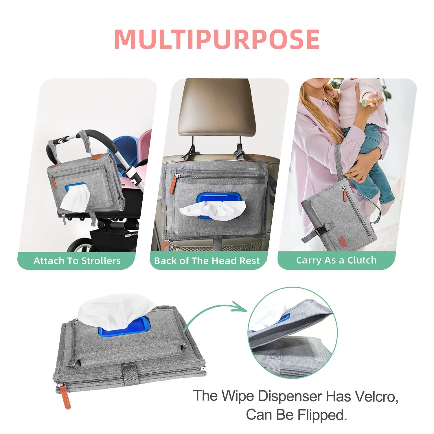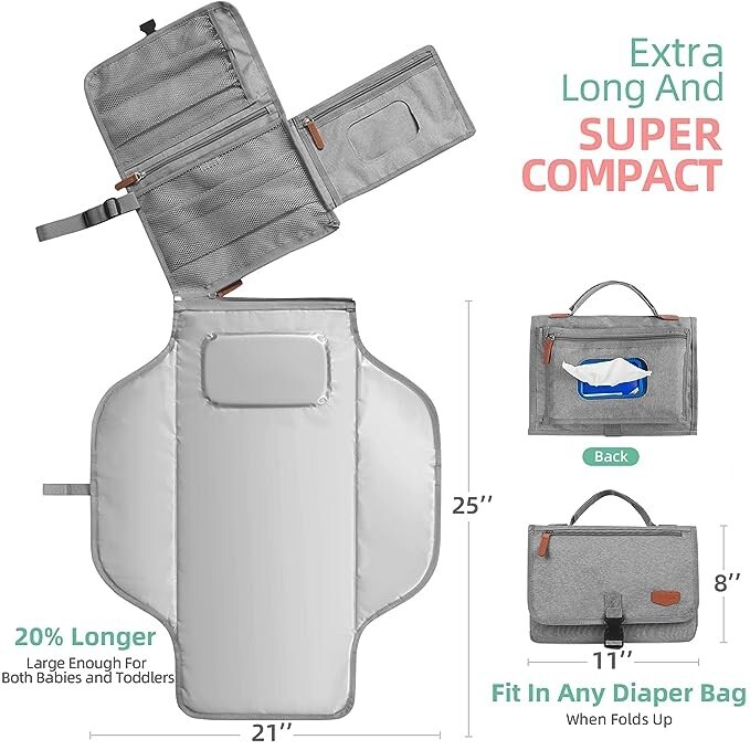 Alatino portable changing pad w/compartments/wipe holder, gray, new