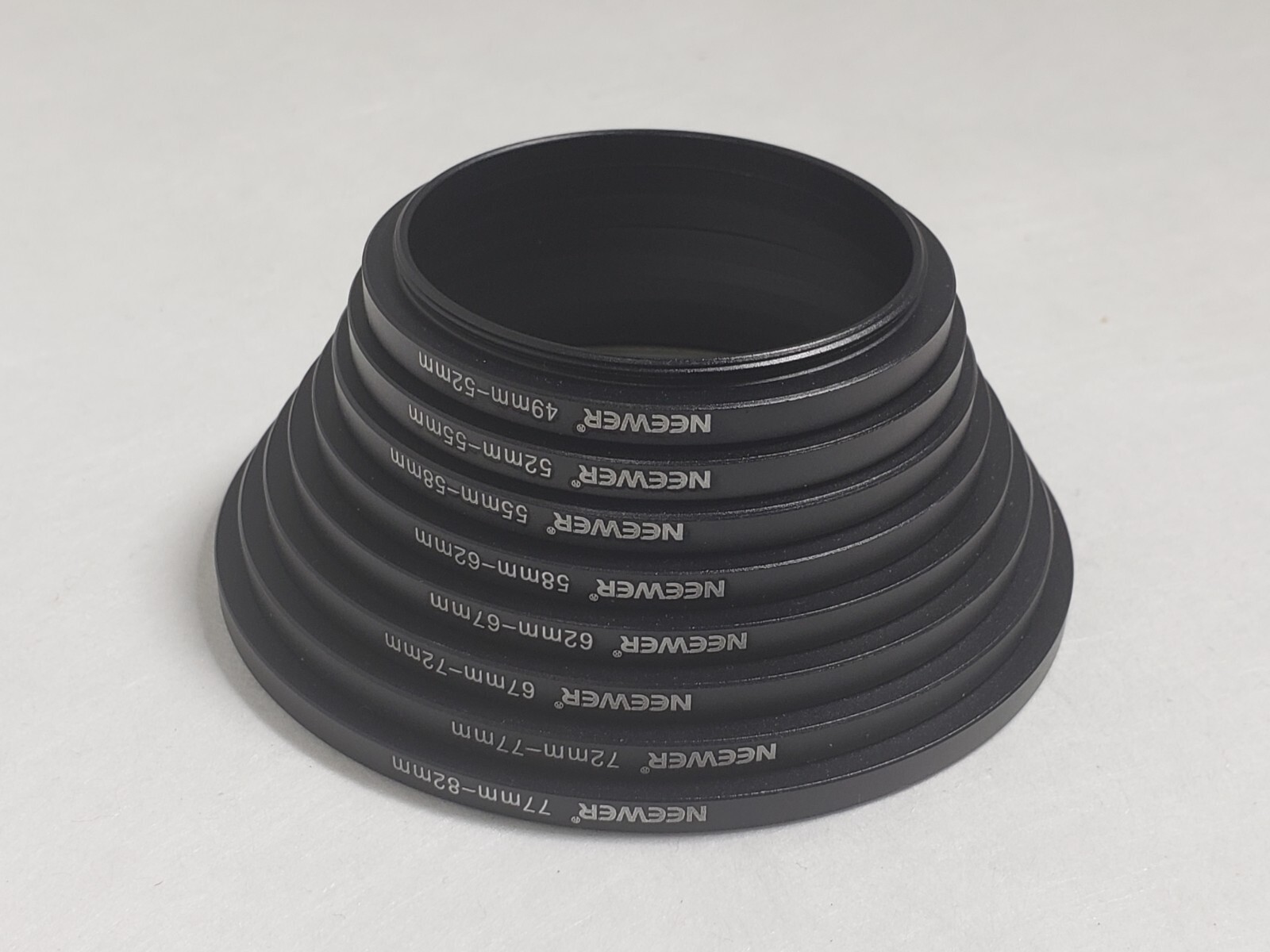 как выглядит Neewer 8 Pieces Step-up Adapter Ring Set 49-52mm 58-62mm 72-77mm 77-82mm Black фото