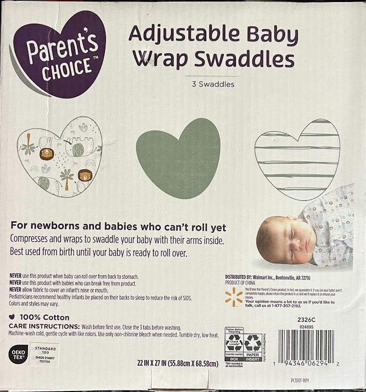 Parent's Choice 100 Cotton 3-Pack Adjustable Baby Wrap Swaddles Jungle 22x27