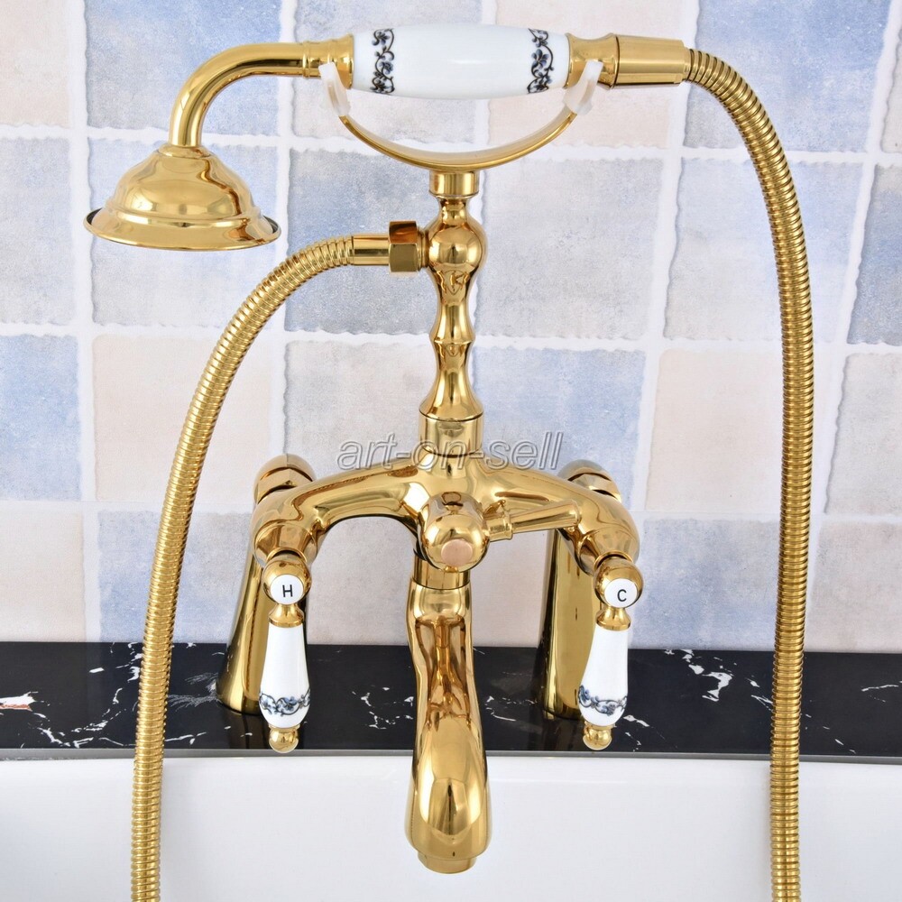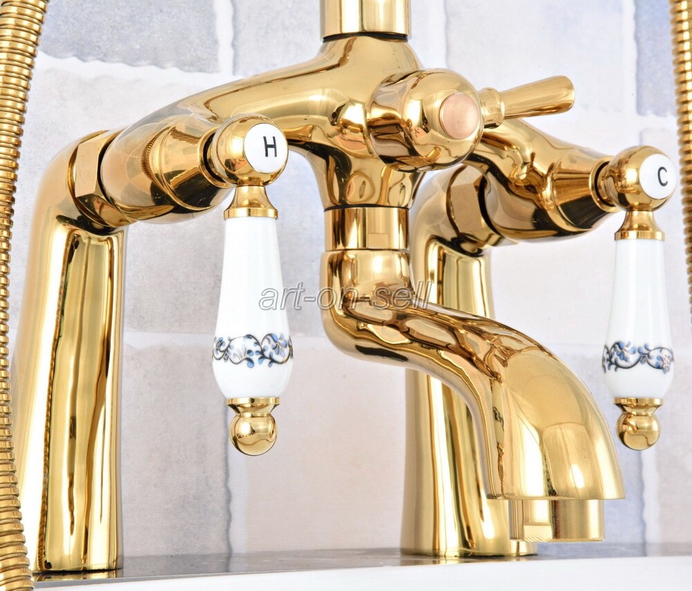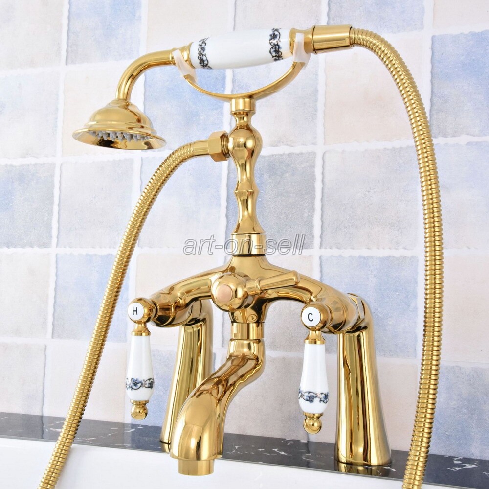 Gold Color Brass Deck Mount Clawfoot Bath Tub Filler Faucet Set Handheld Shower