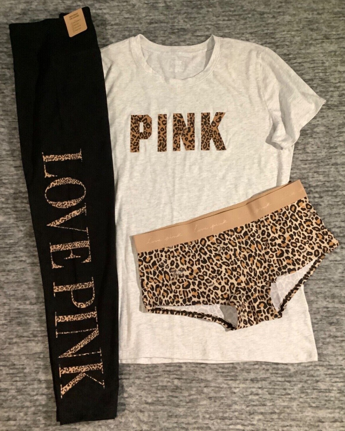 как выглядит Victorias Secret Pink Leopard Logo SS Tee Shirt Leggings Boyshort Set L NWT фото