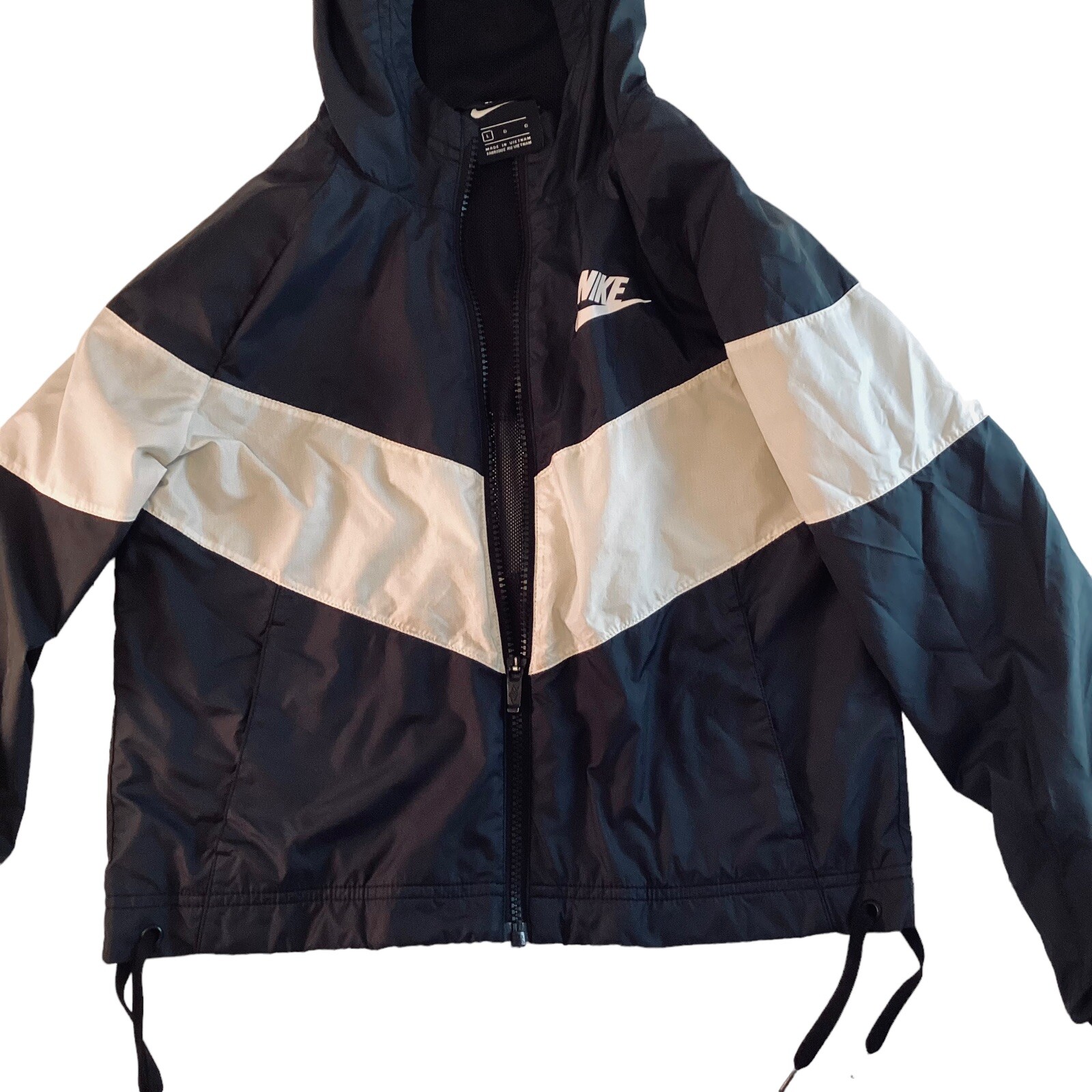 NIKE Windbreaker Jacket Boys L with Hoodie Zip Sportswear Black White 6-7 Yrs