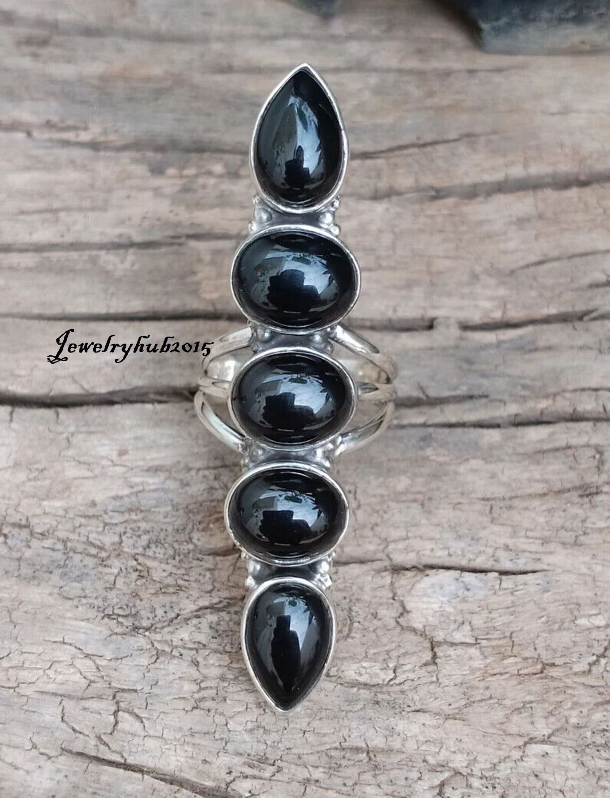 Black Onyx Ring Solid 925 Sterling Silver Five Gemstone Ring All Size MO