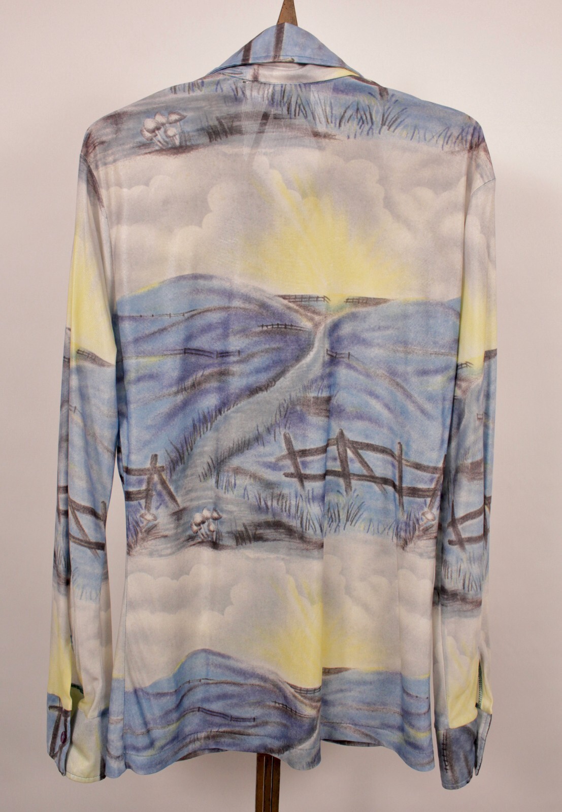 Men's VTG 70s Yellow Blue Landscape Theme Polyester Shirt Sz S 1970s Disco