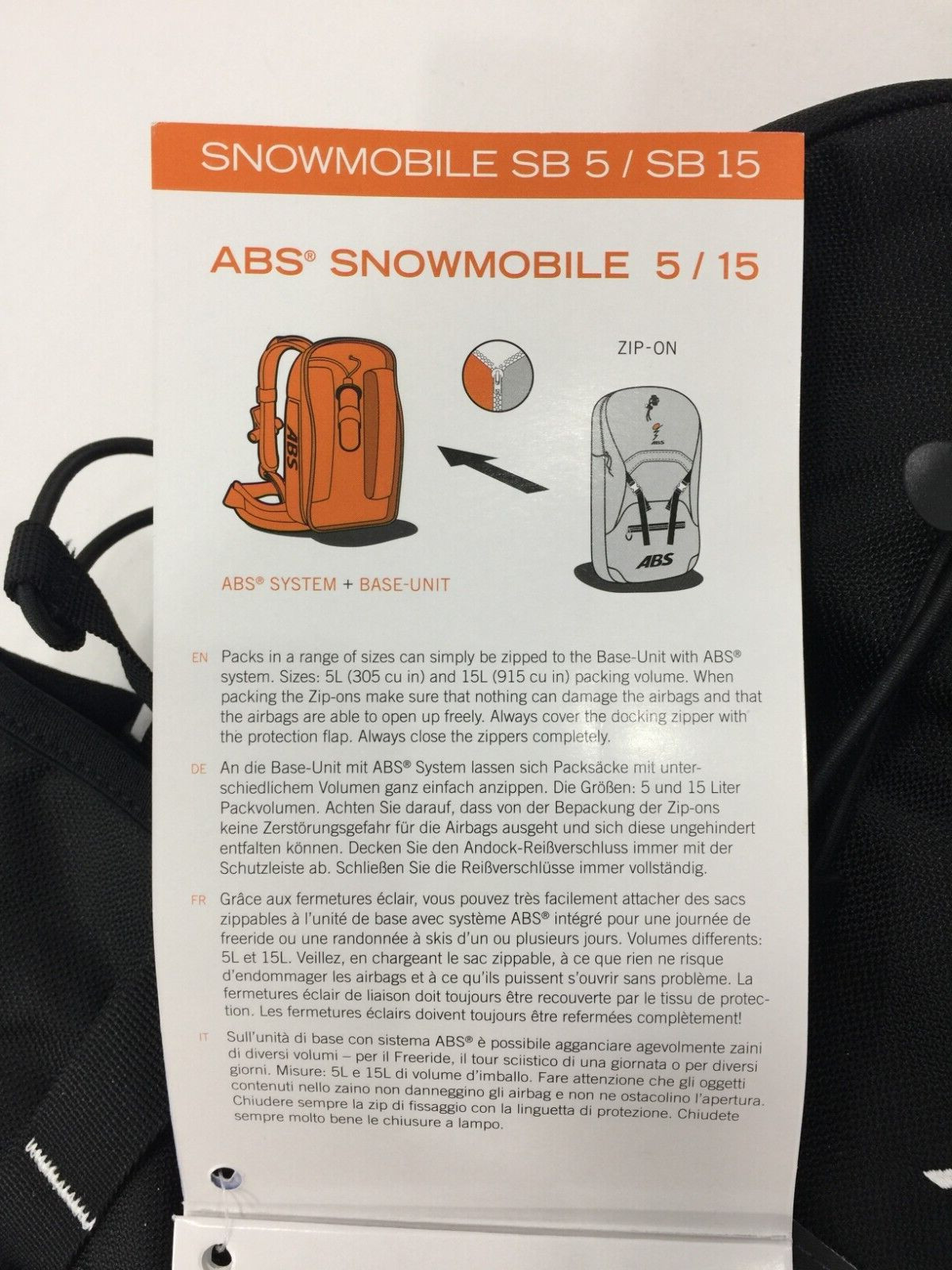 ABS Vario 15 XT Snowmobile SB 15 Zip Off Bag for Base Backpack Black NO02-4900 2