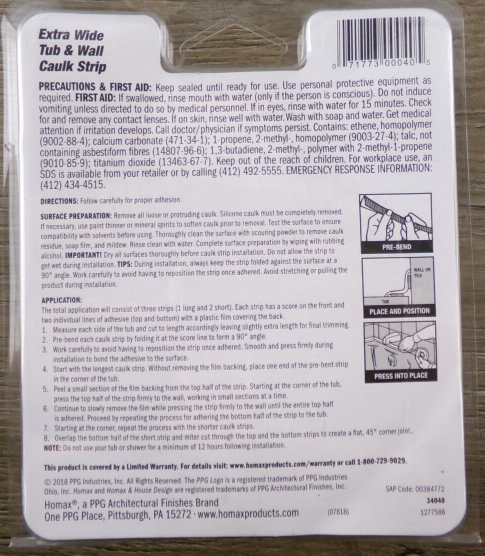 Homax 34040 Myro 1-5/8in x 11ft White Tub Wall Caulkstrip Peel Stick, New A4