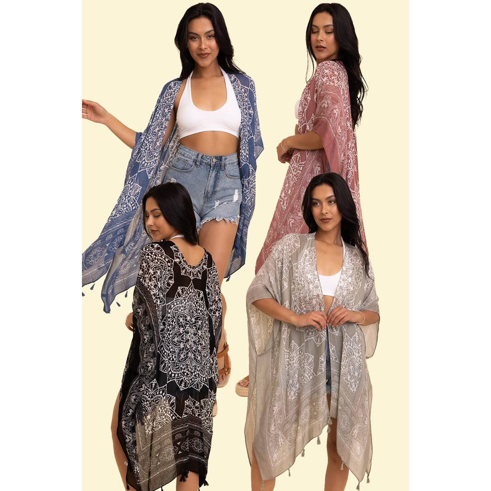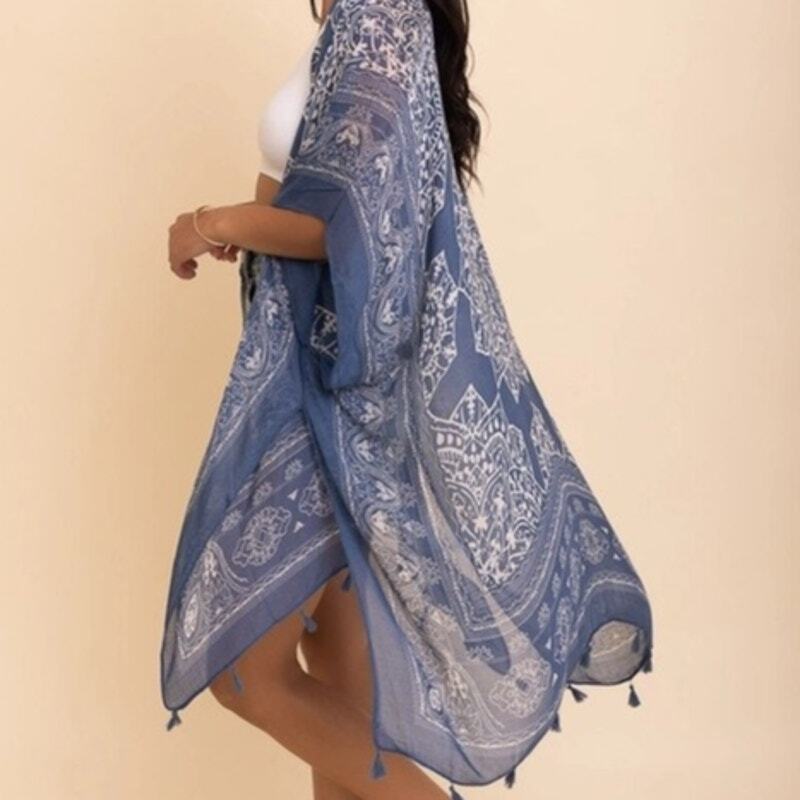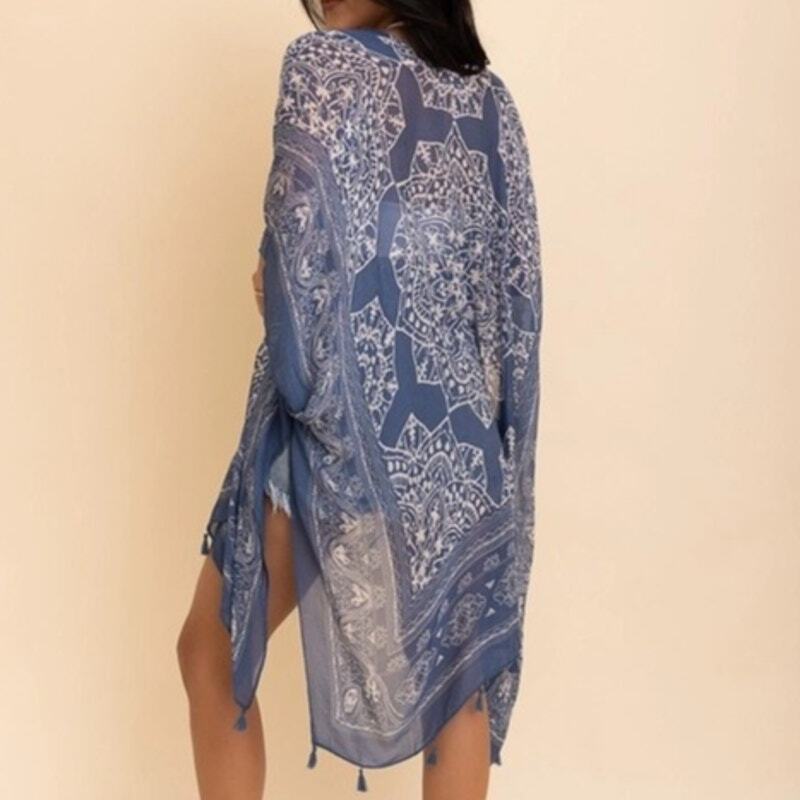 Boho Festival Lightweight Mandala Kimono Cardigan Tassels Navy Blue