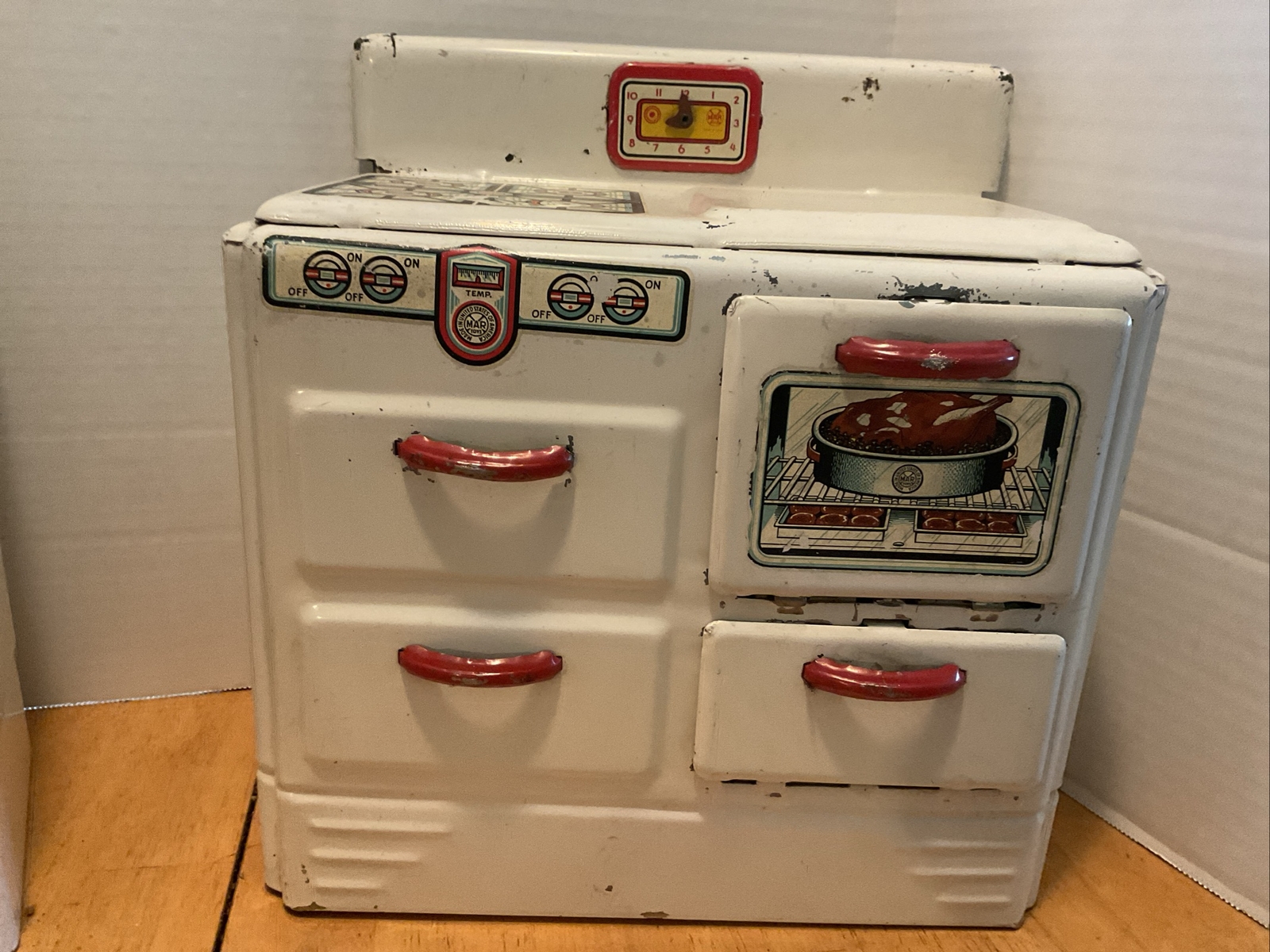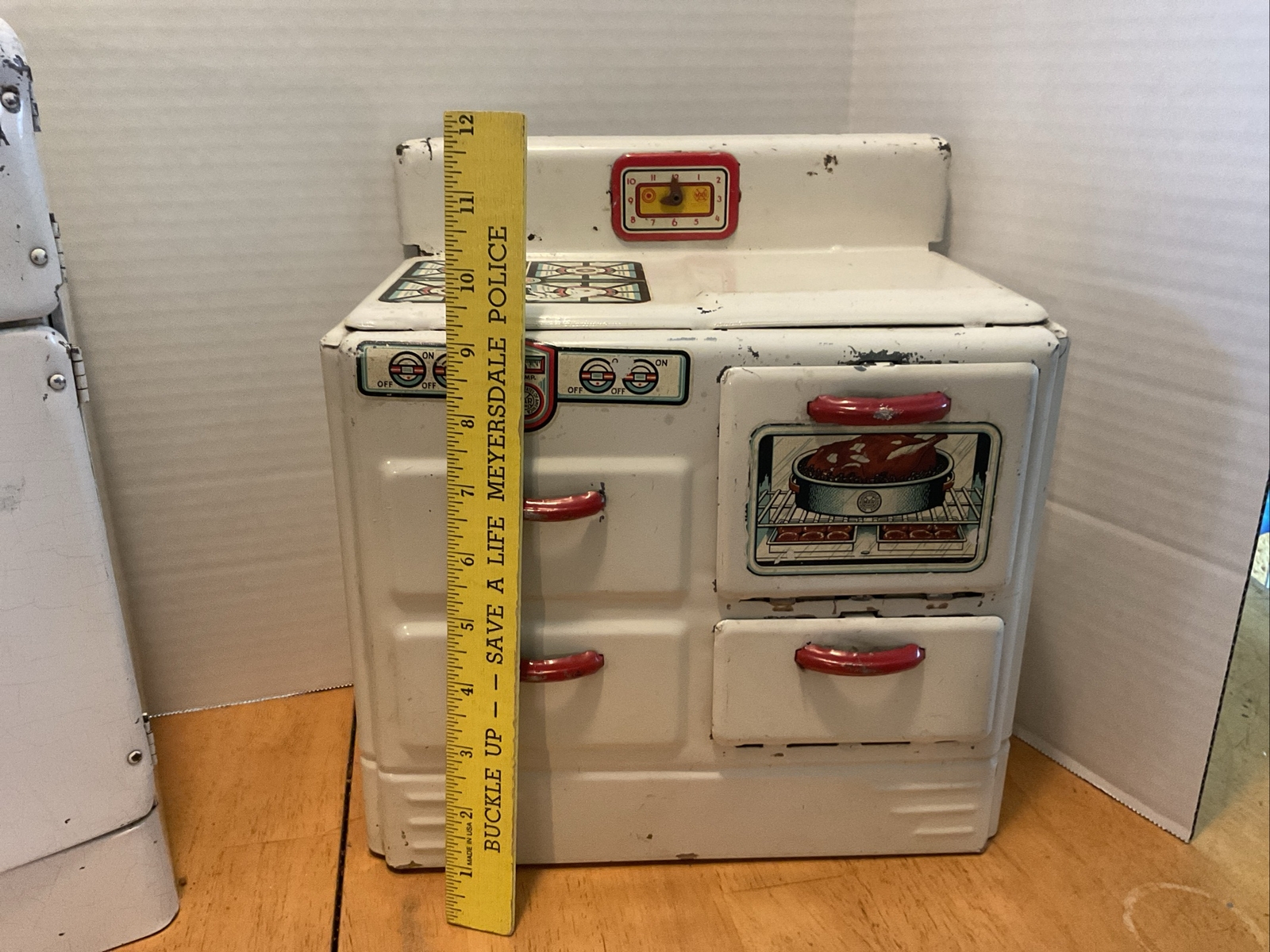 1930s Marx Pretty Maid Toy Oven, Metal Enamel Tin Range Stove Wolverine Fridge