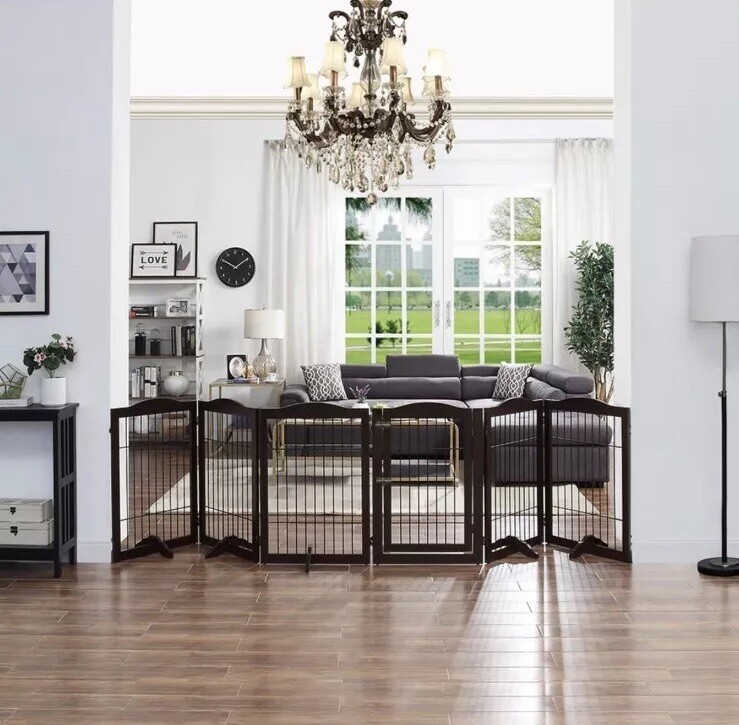 как выглядит 6 Panels Freestanding Dog Gate with Walk Through Door 5 Support Feet Espresso фото