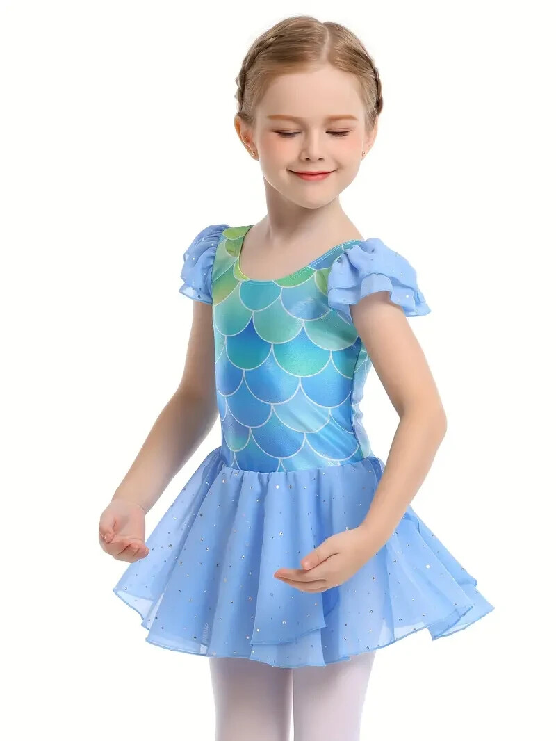 как выглядит Gradient Fish Scales Print Dance Dress For Girls, Chiffon Flutter Sleeve Ballet фото