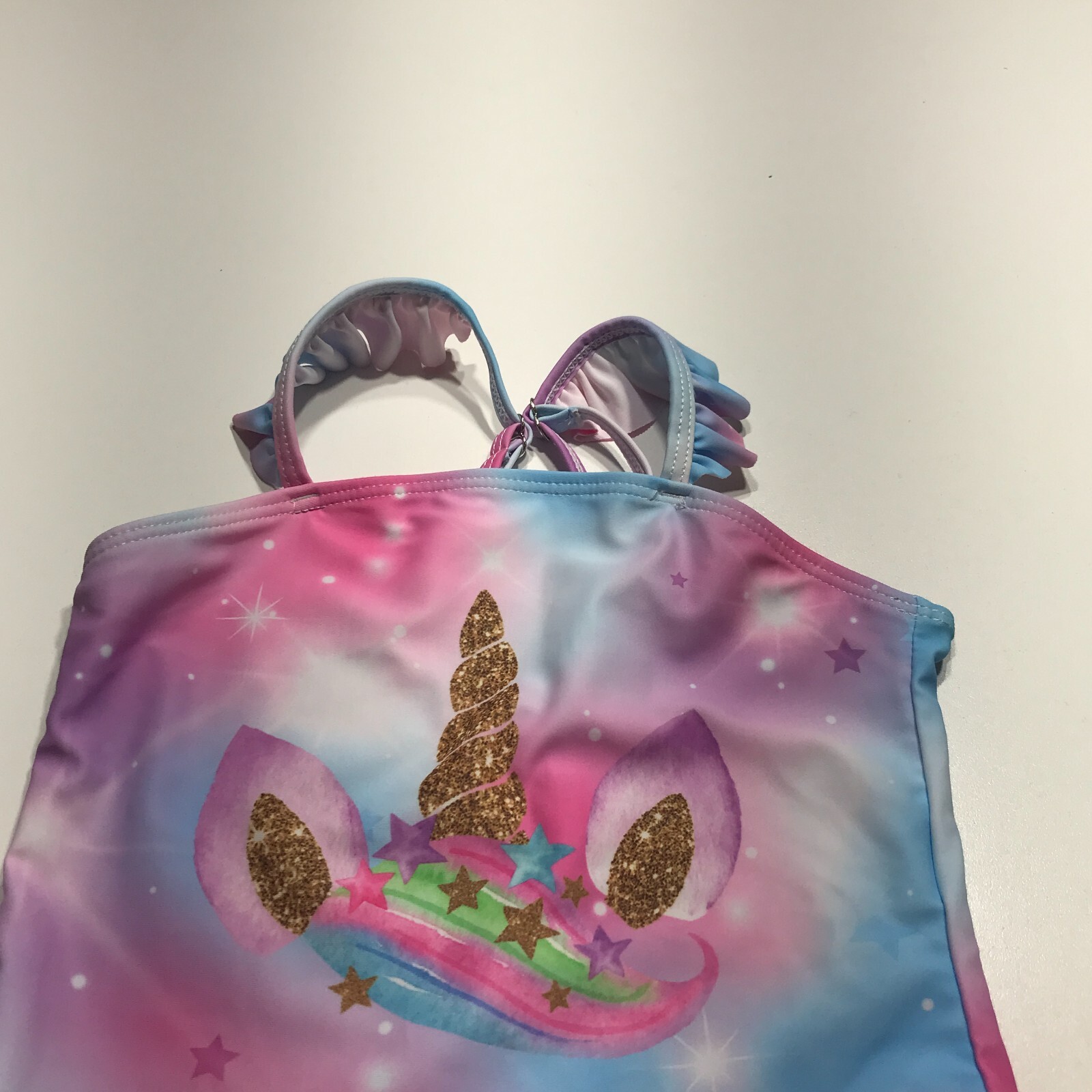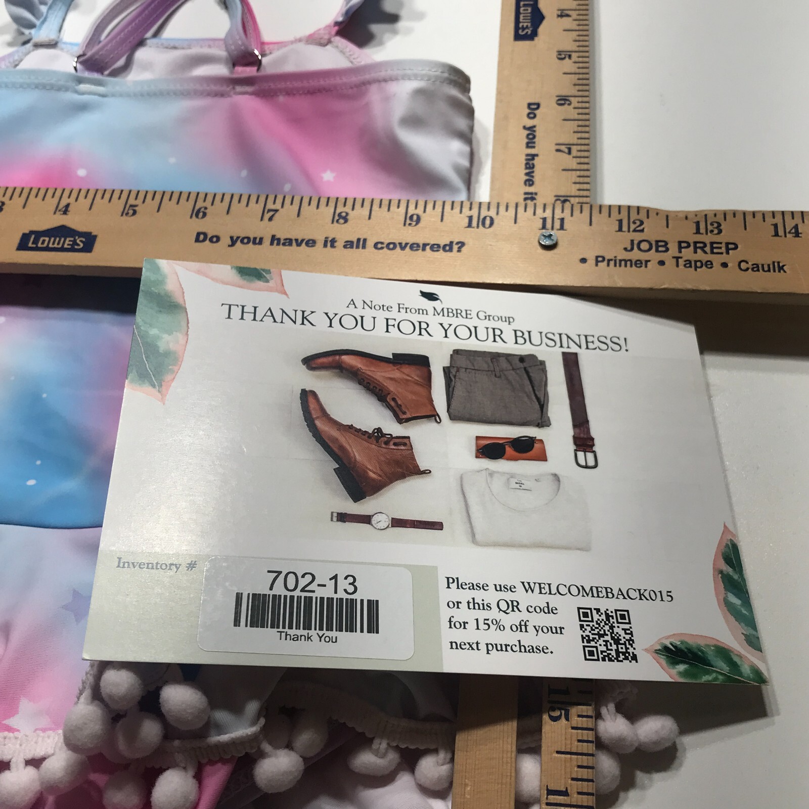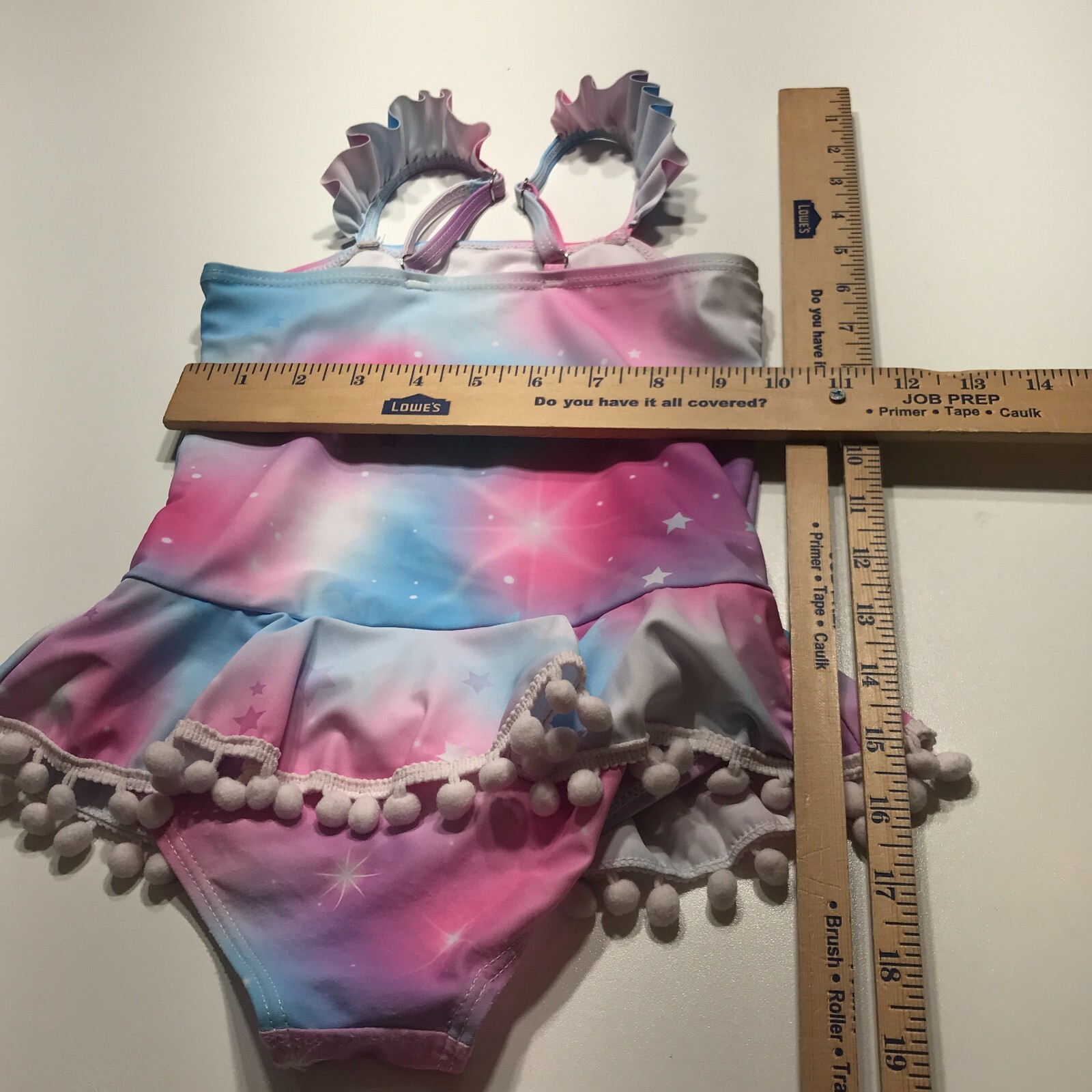 NWOT Pink Blue Tie Dye Ruffled Strap Pom Pom Swimsuit Girls Toddler Size 116/5-6