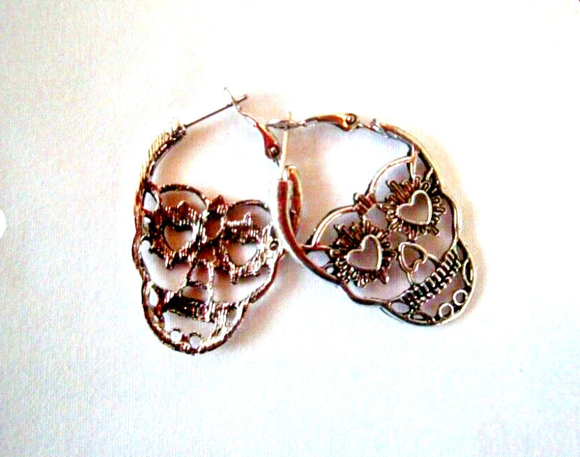 Sugar Skull Day of the Dead Hoop Earrings Silver Tone Open Design Halloween Goth
