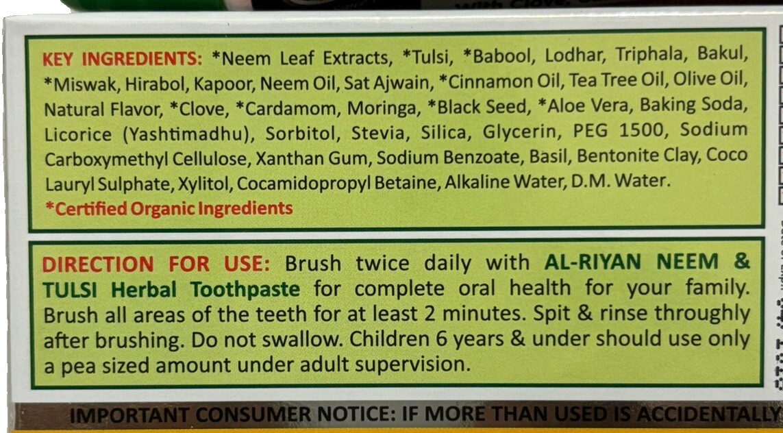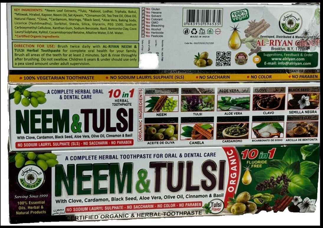 6 Pk ORGANIC NEEM TULSI Herbal Toothpaste By AL-RIYAN, Fluoride Free Vege Base