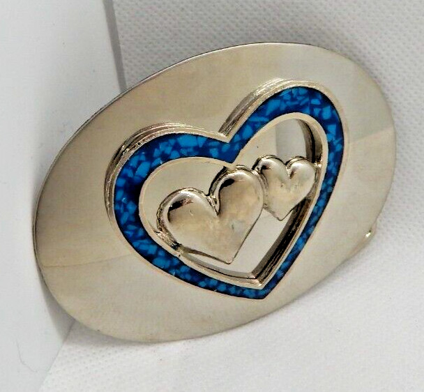 Ladies Twin Hearts Belt Buckle 3.25 Polished Metal Heart Love Peace Blue Inlay