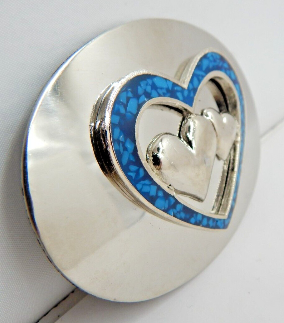 как выглядит Ladies Twin Hearts Belt Buckle 3.25" Polished Metal Heart Love Peace Blue Inlay фото