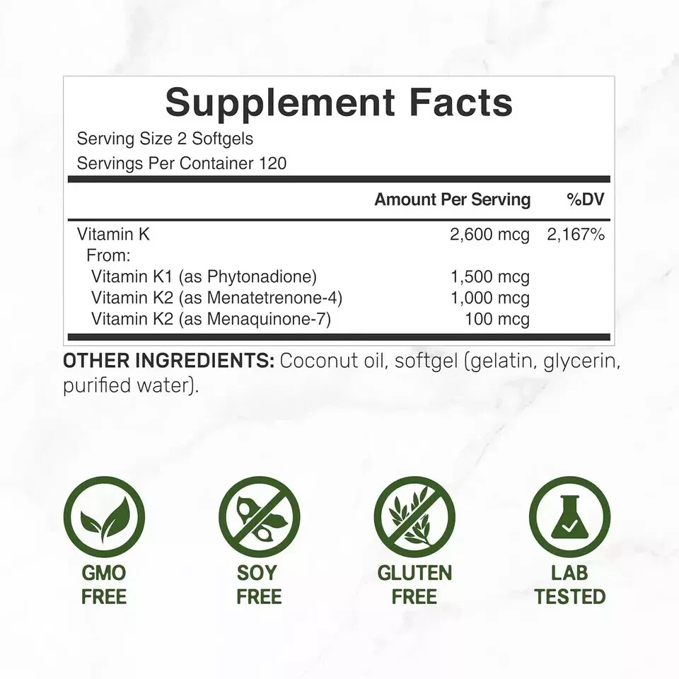 Vitamin K Complete - High Potency Vitamin K2 MK-7 and MK-4 K1, 240 Softgels