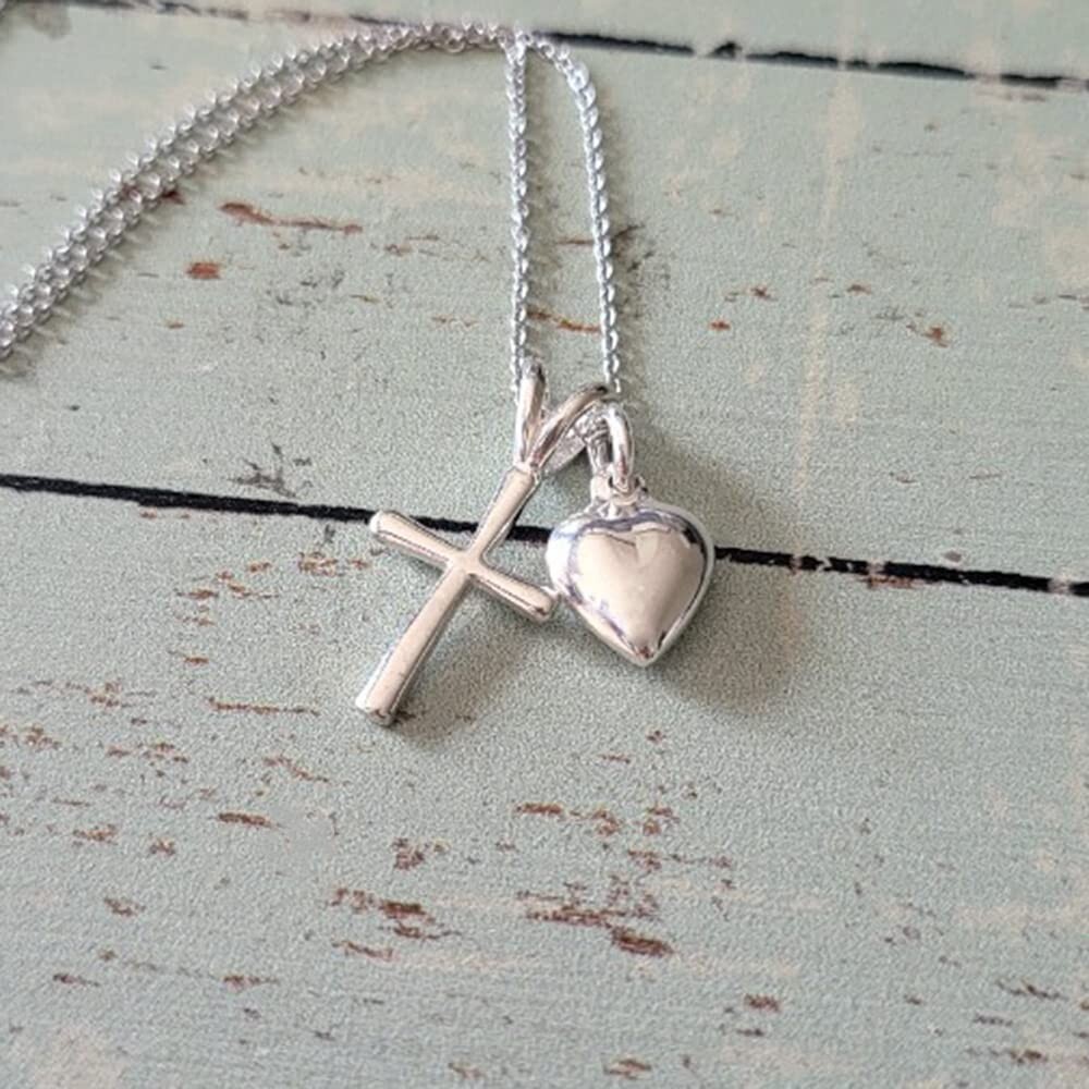 Sterling Silver Tiny Cross with Tiny Heart Charm Necklace