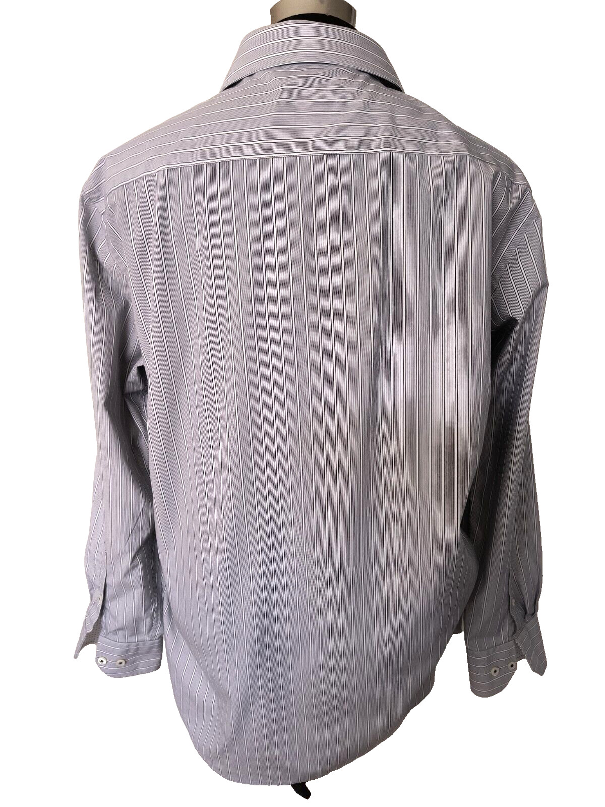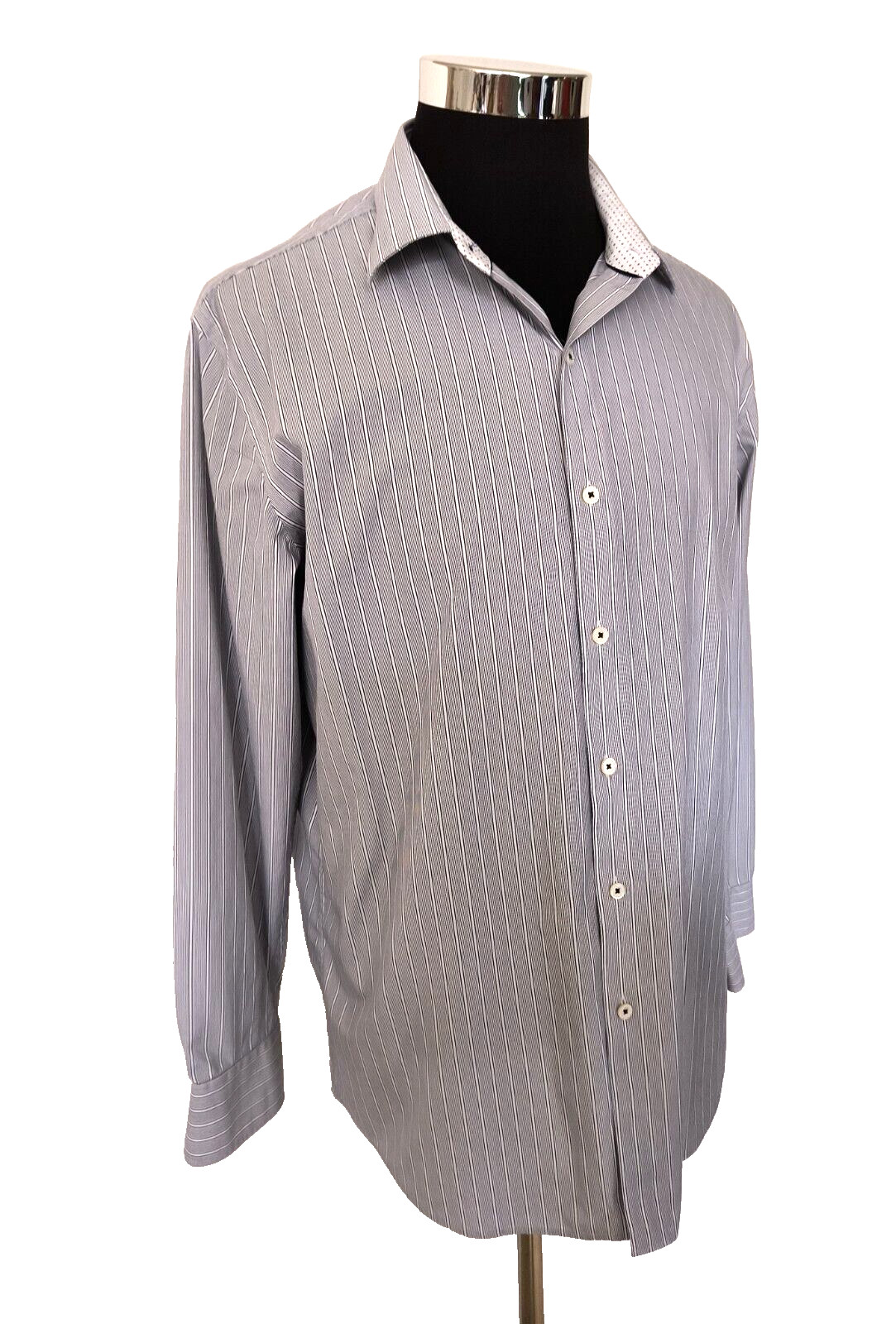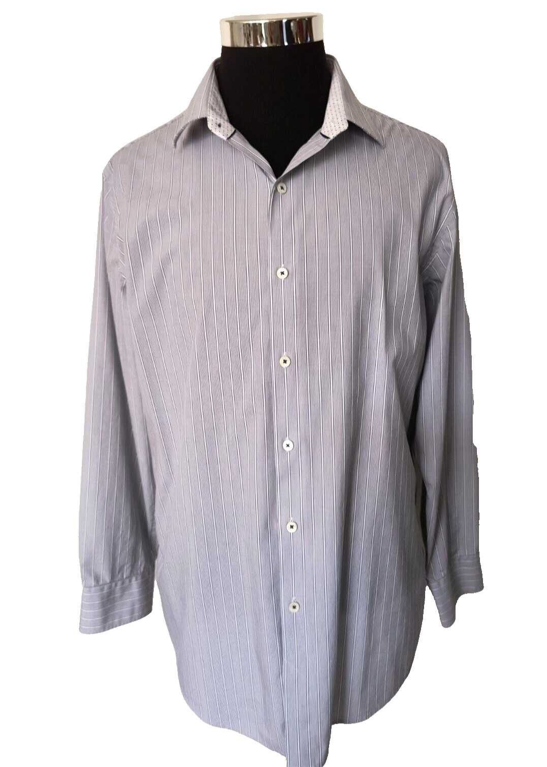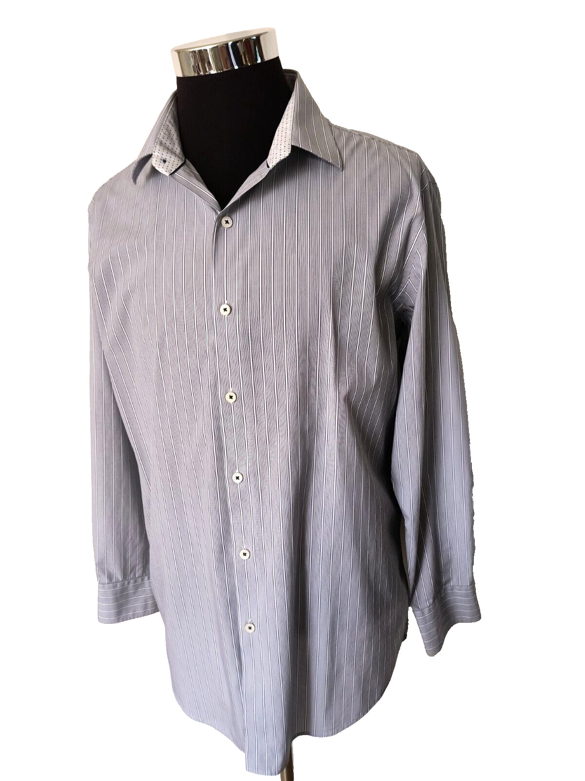 Bugatchi Dress Shirt Men's Size 17 Button Front Gray/White Stripes Cotton