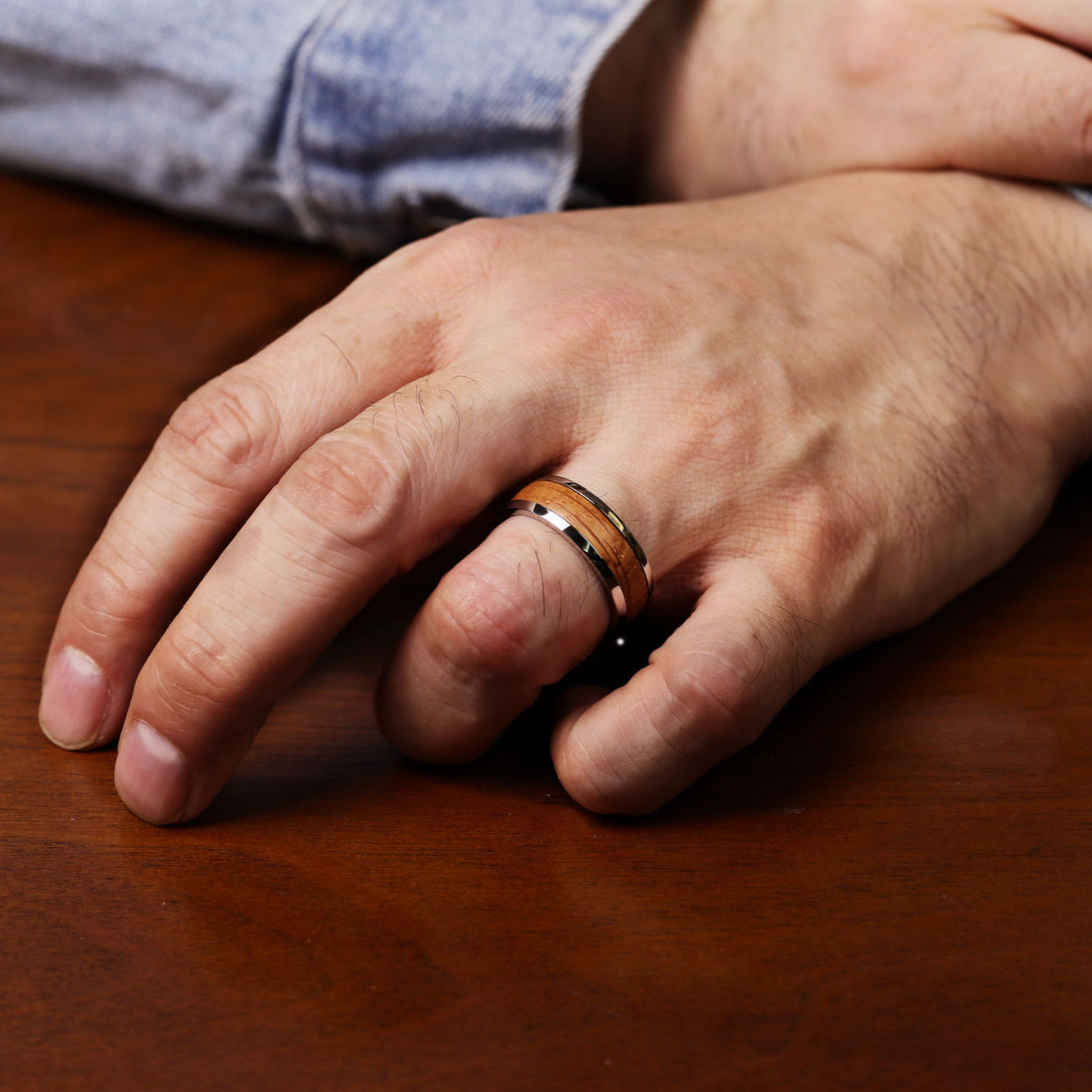 как выглядит Stainless Steel Ring with Whiskey Barrel Wood Inlay and Clear Resin - Size 8-12 фото