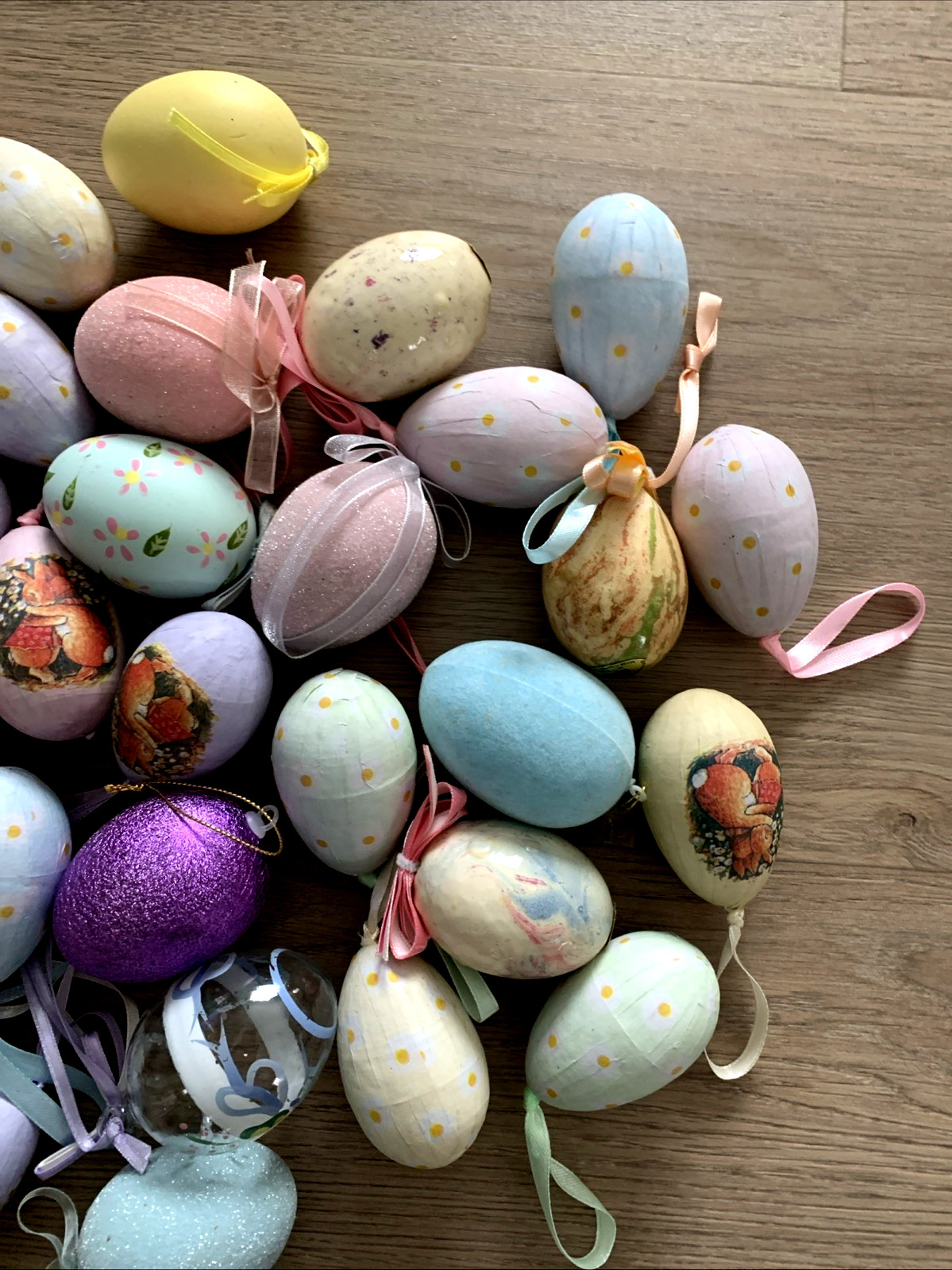• Lot Of 42 Easter Egg Ornaments Variety Paper Mache Painted Real Wood Eggs Etc