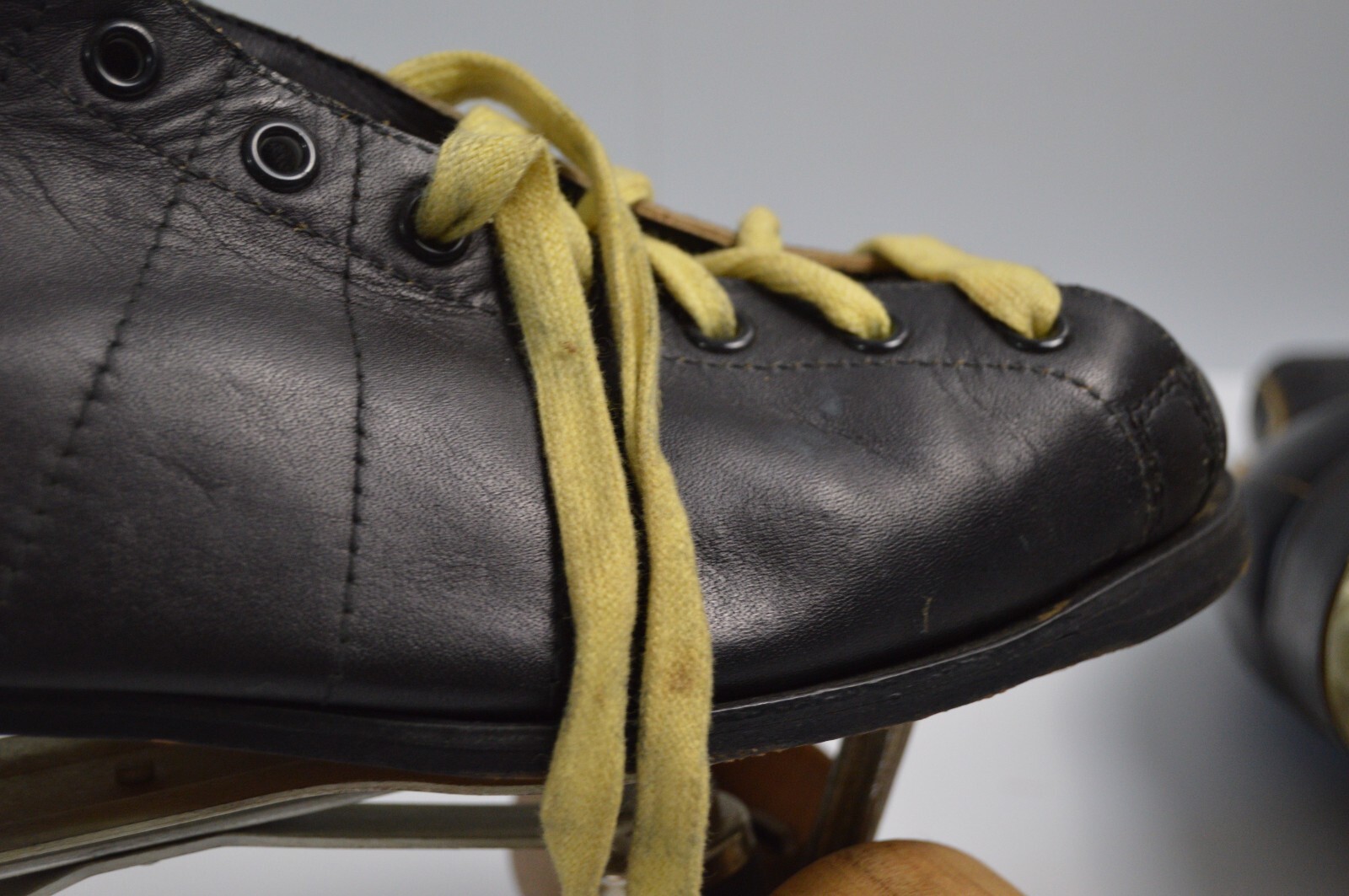 как выглядит Vintage Mens Leather Roller Skates Wooden Am Eagle Wood Wheels Size 7 Box фото