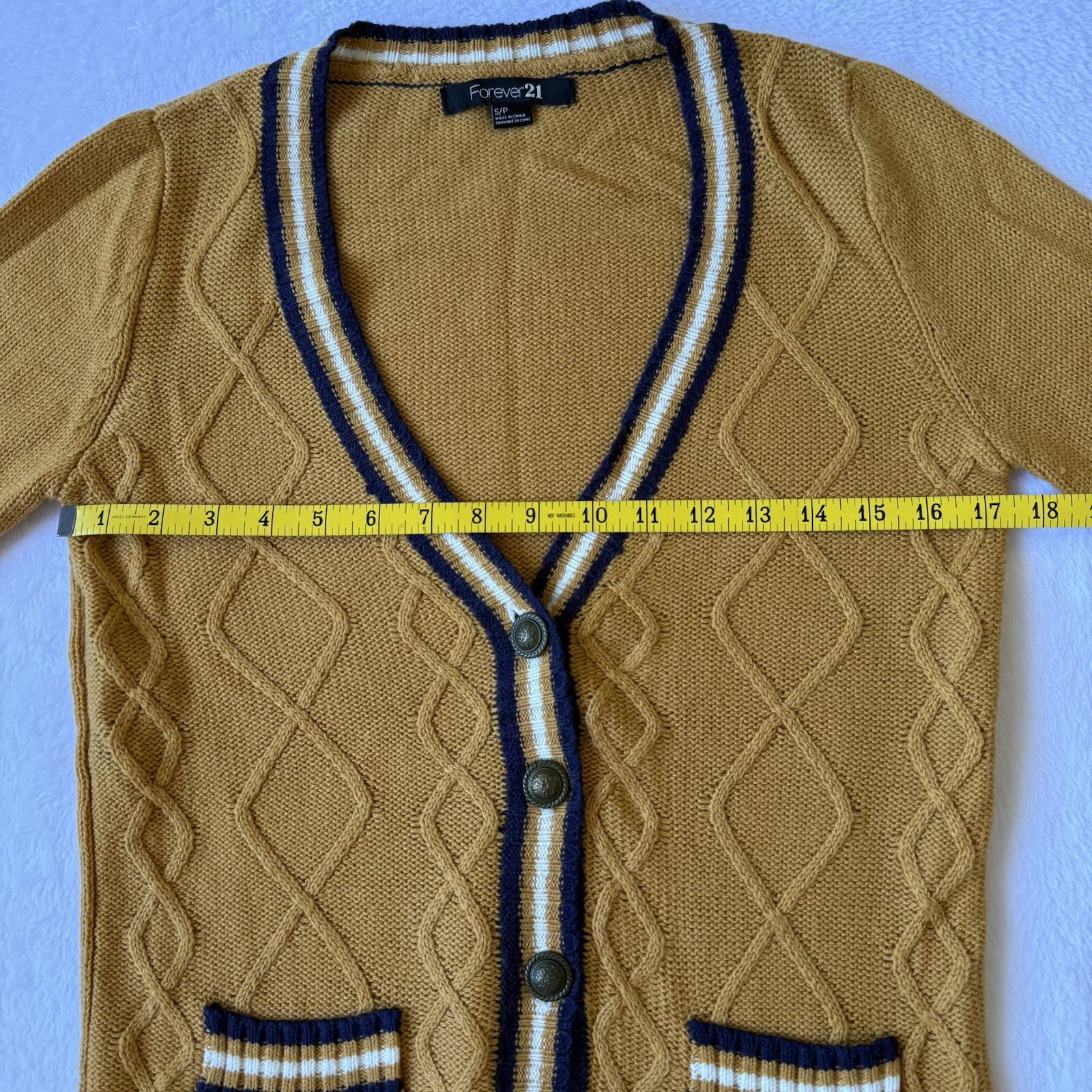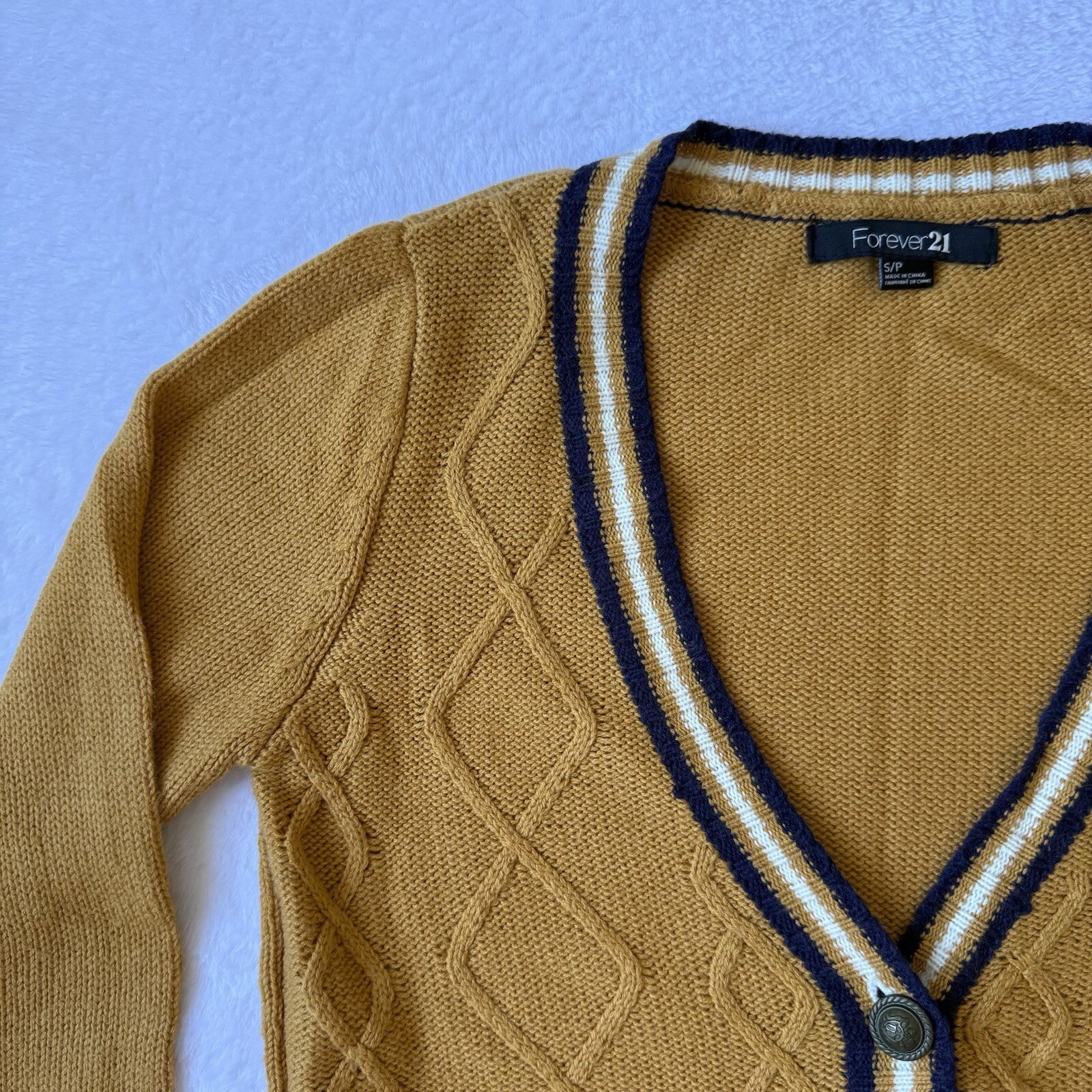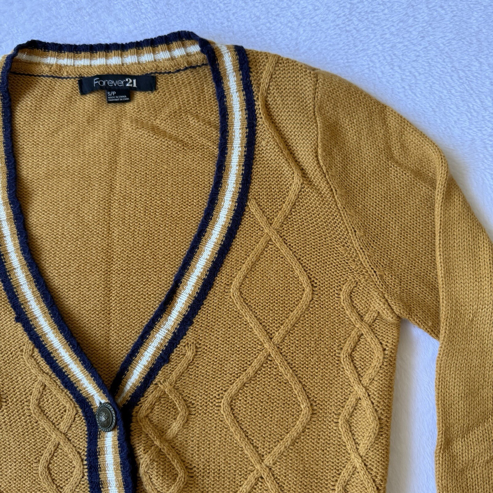 Forever 21 Cardigan Gold/Blue Button Up V Neck Pockets Cable Knit