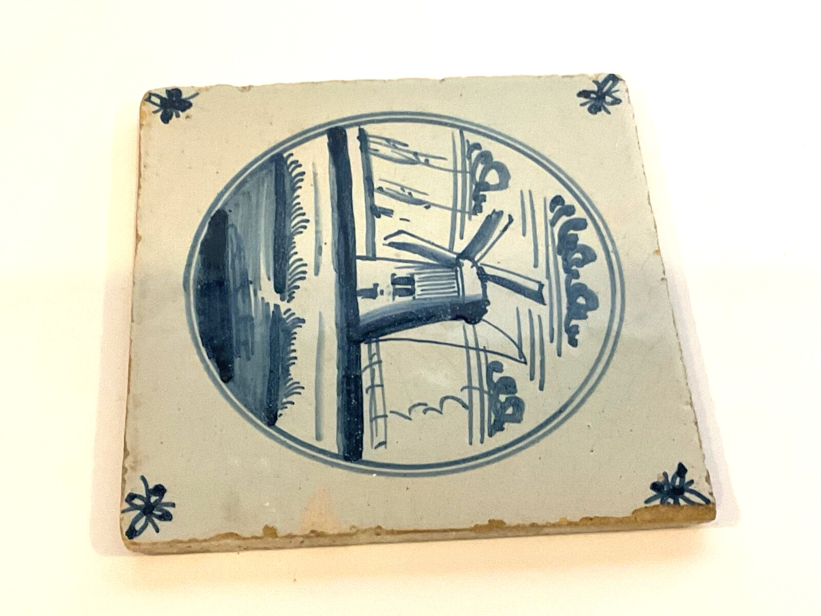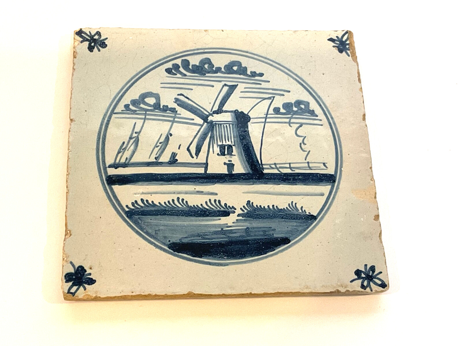 • 18th C. Dutch Delft Blue White Tile Coastal Landscape w. Windmill Sail Boats