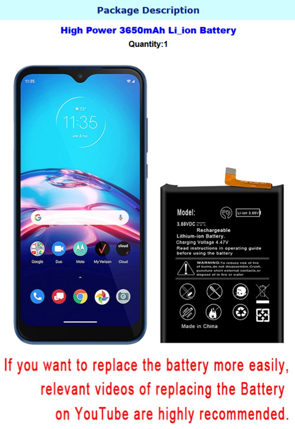Long Lasting Upgraded 3650mAh Internal Battery for Motorola Moto E 2020 XT2052