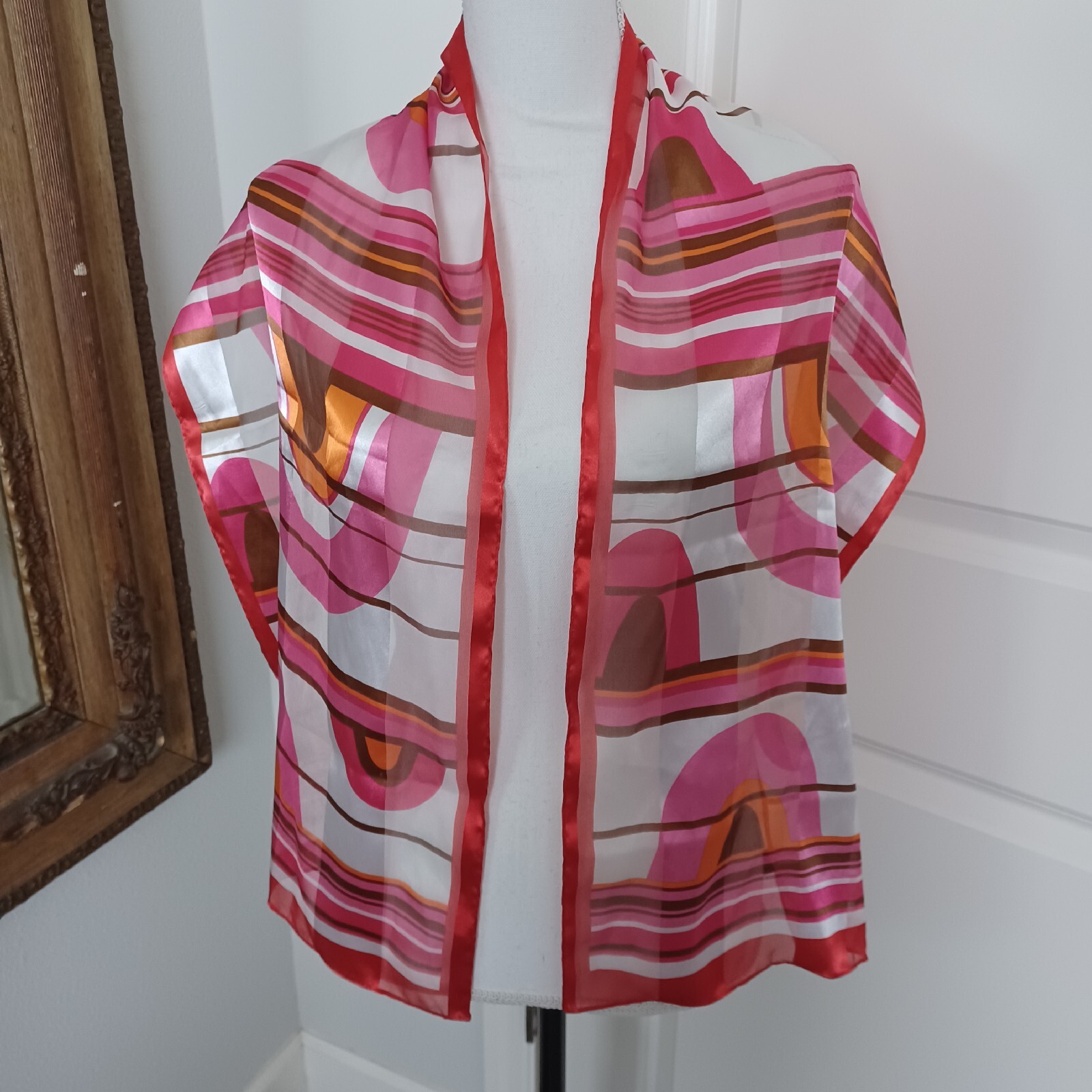 Vintage 70s 80s Colorful Pink Red Orange White Geometric Long Scarf 13 x 58