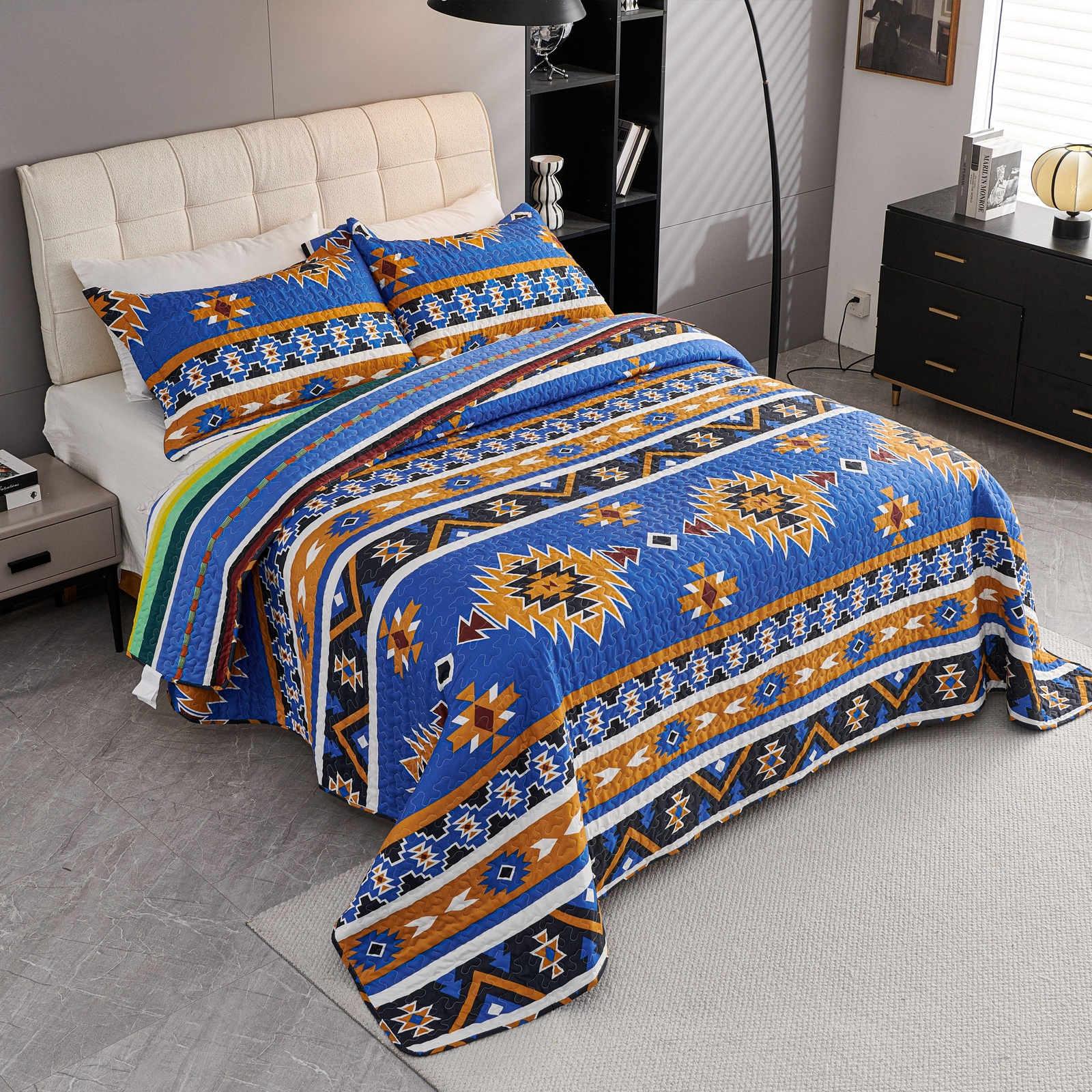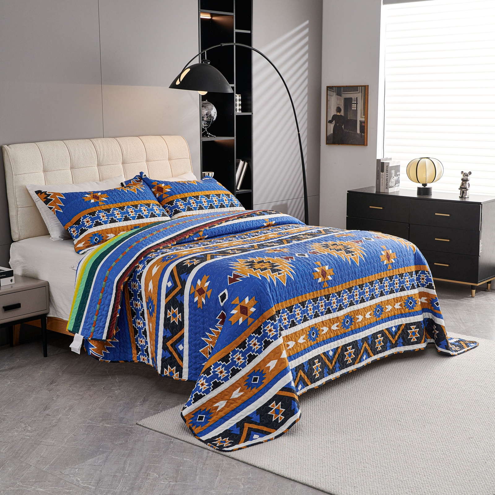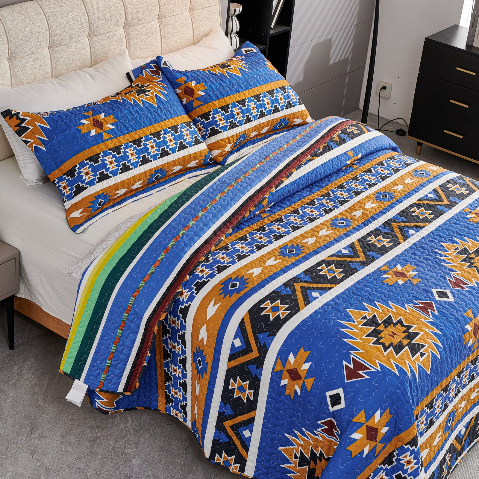 как выглядит 3 Pcs Boho Colorful Polyester Quilt Set, Geometry Printed Bedspread Coverlet Set фото