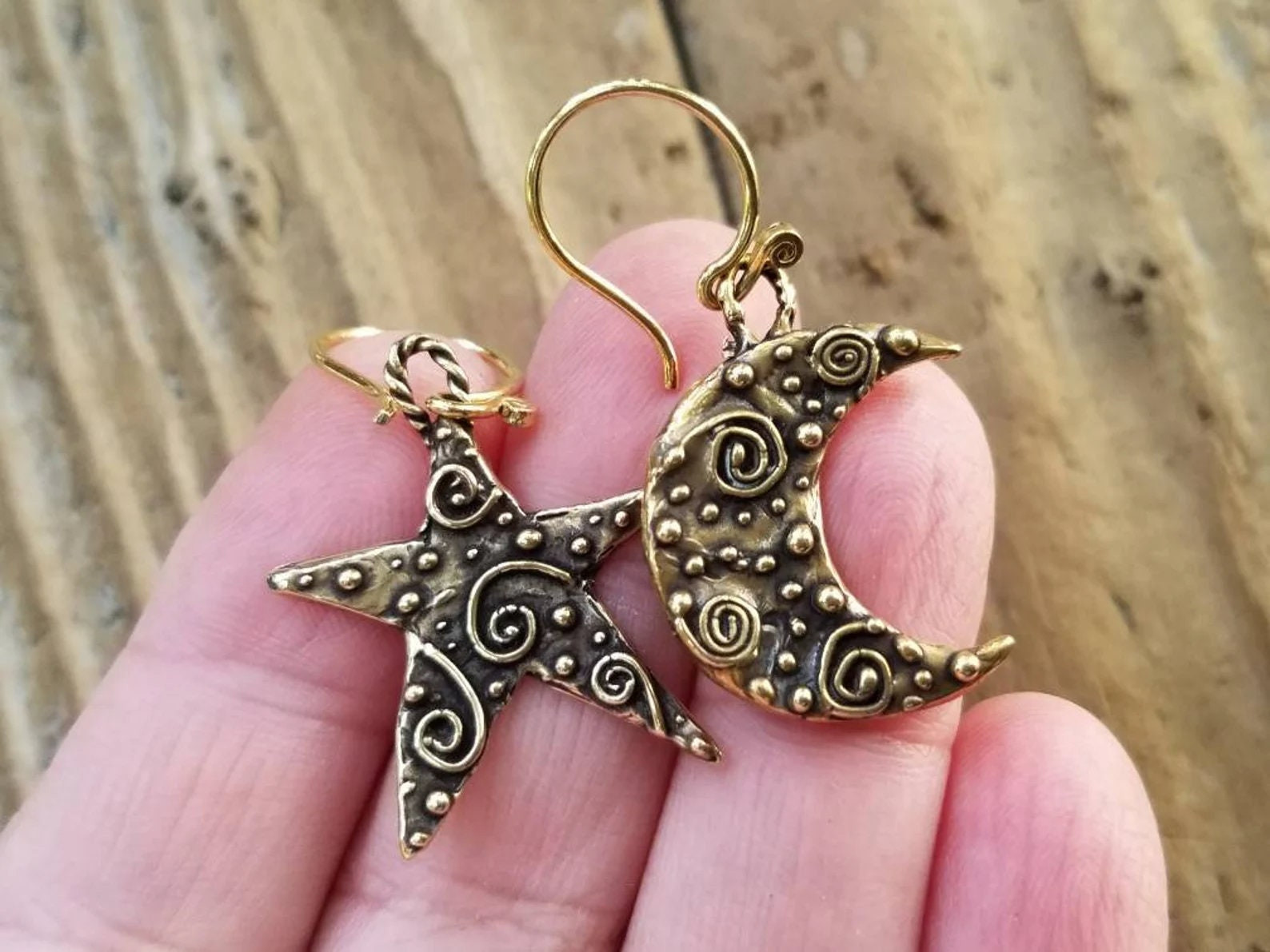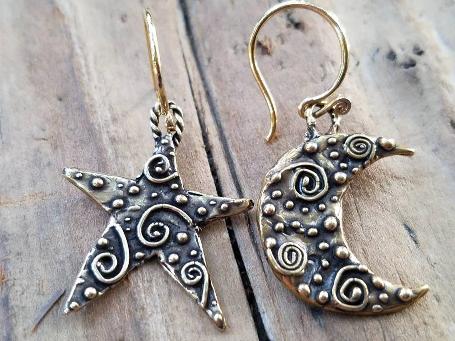 как выглядит Gold Bronze Moon and Star Earrings, Gold Spiral Moon and Star Jewelry фото